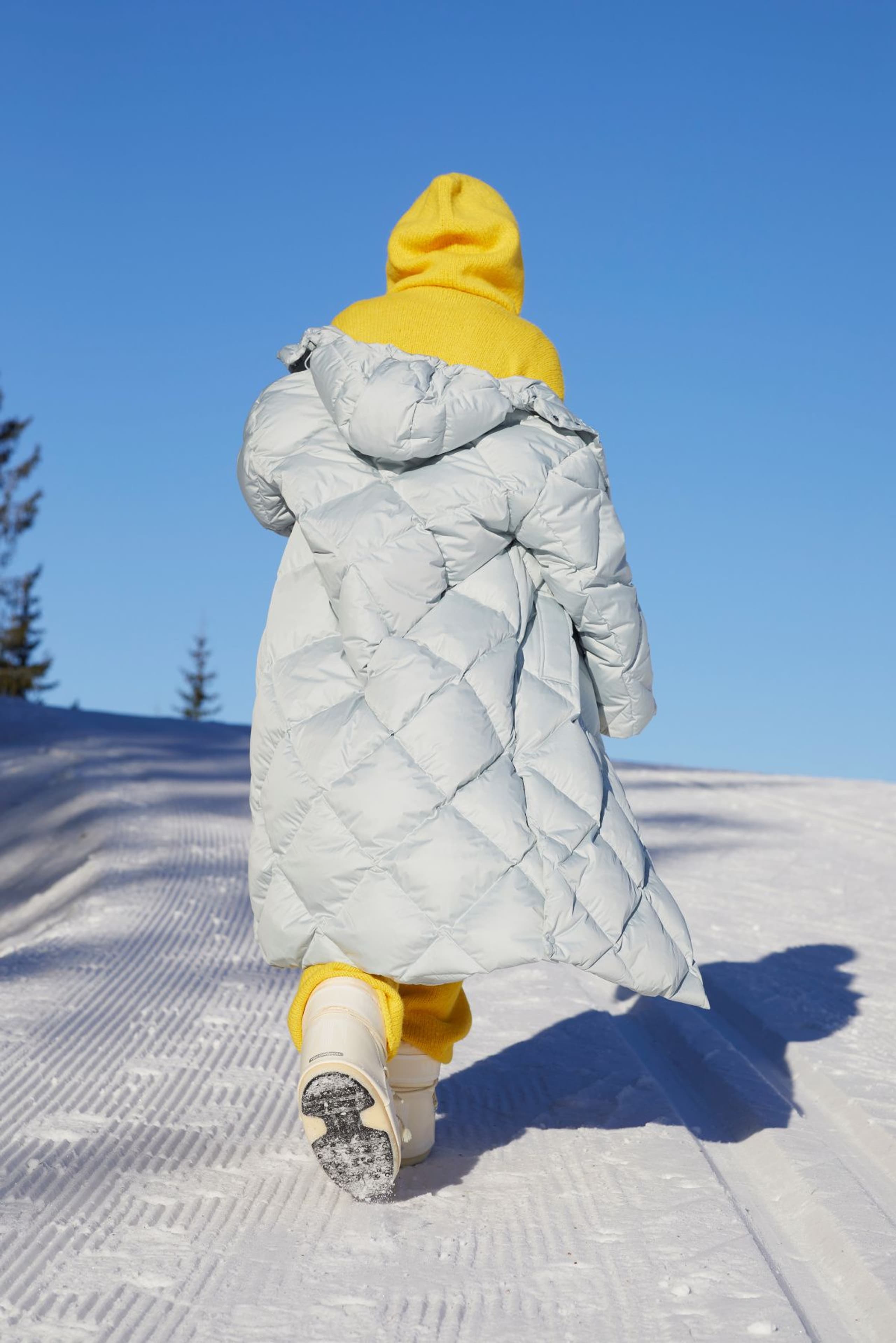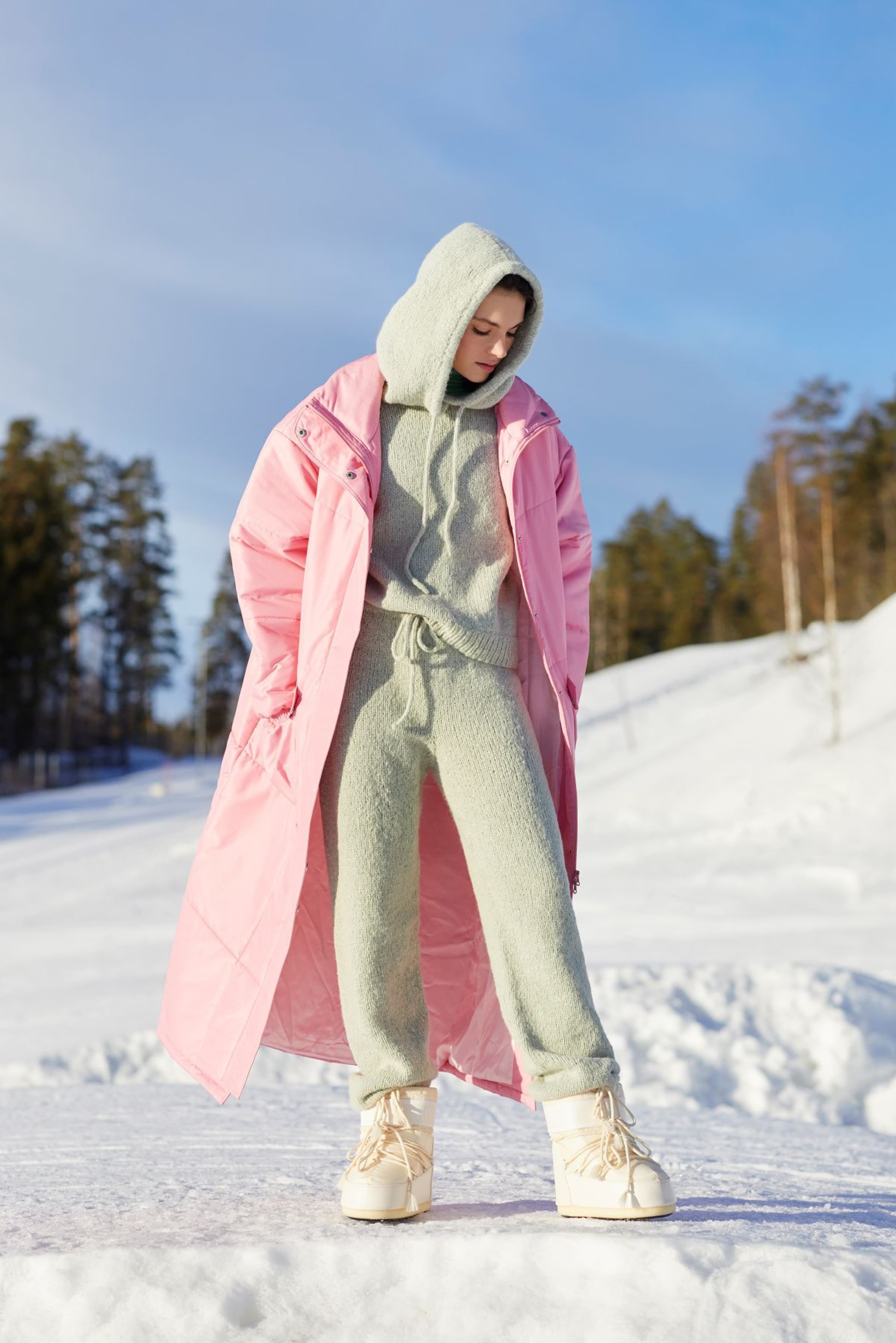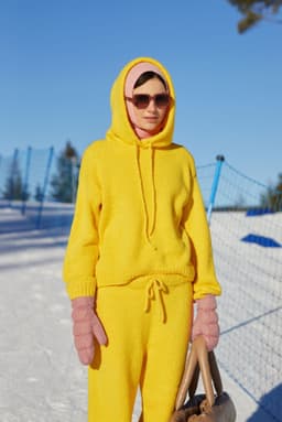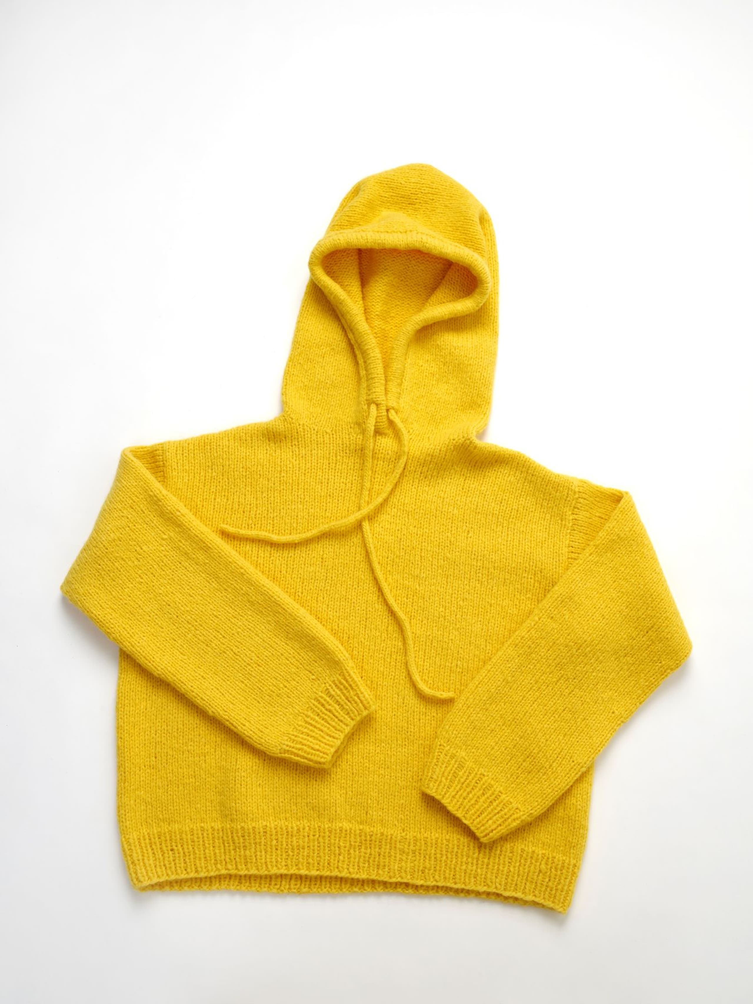 Becca hettegenser er en glattstrikket oversized genser med en stor, herlig hette. Den strikkes nedenfra og opp, med isydde ermer. Hetten strikkes på til slutt og formes ved å felle midt bak. Den har en løpegang med en strikket snor i åpningen.