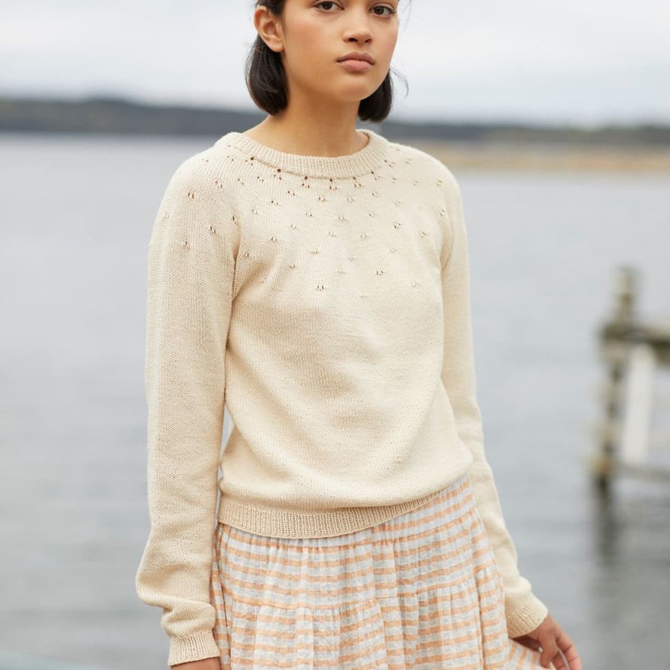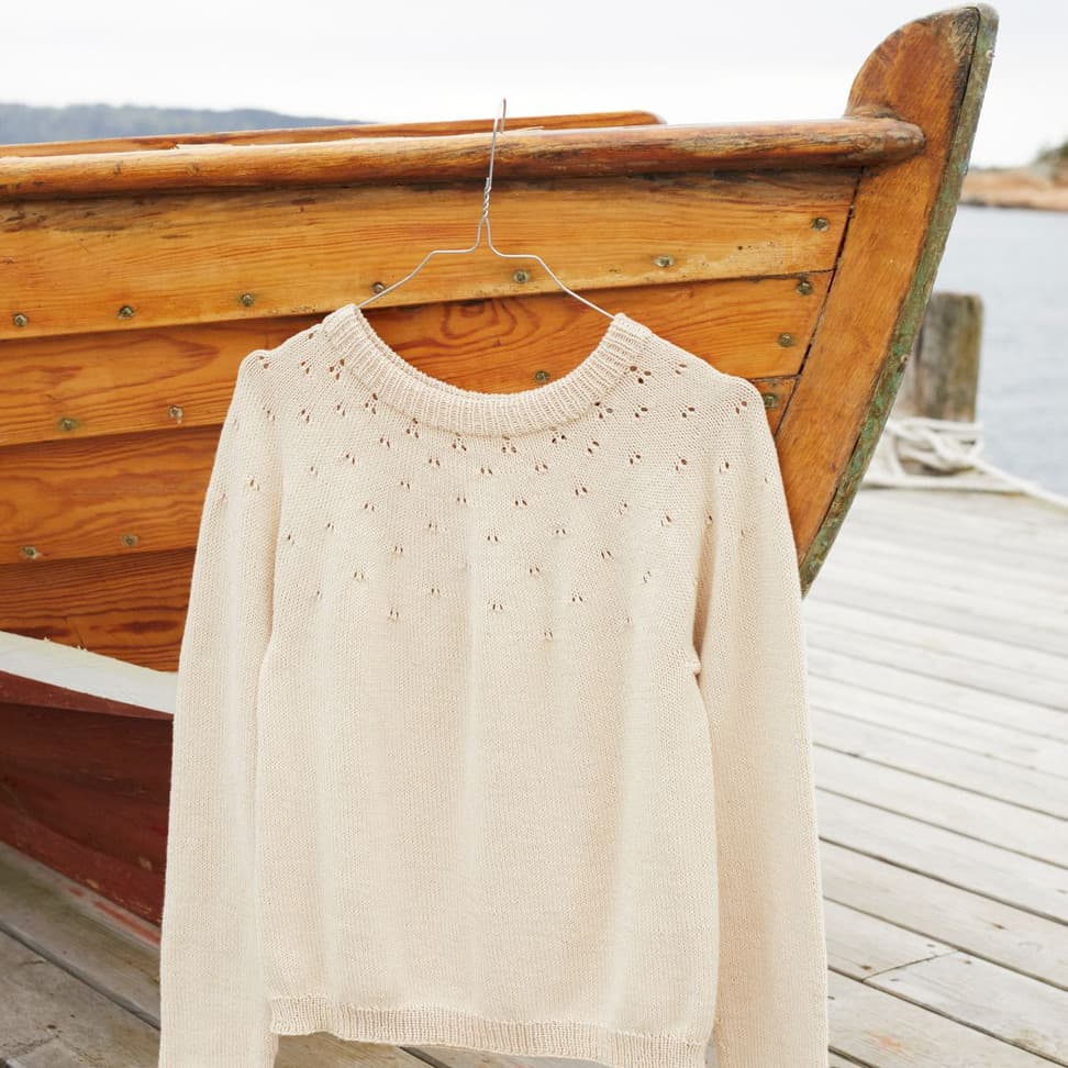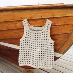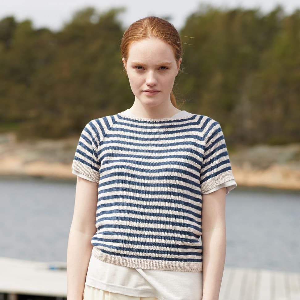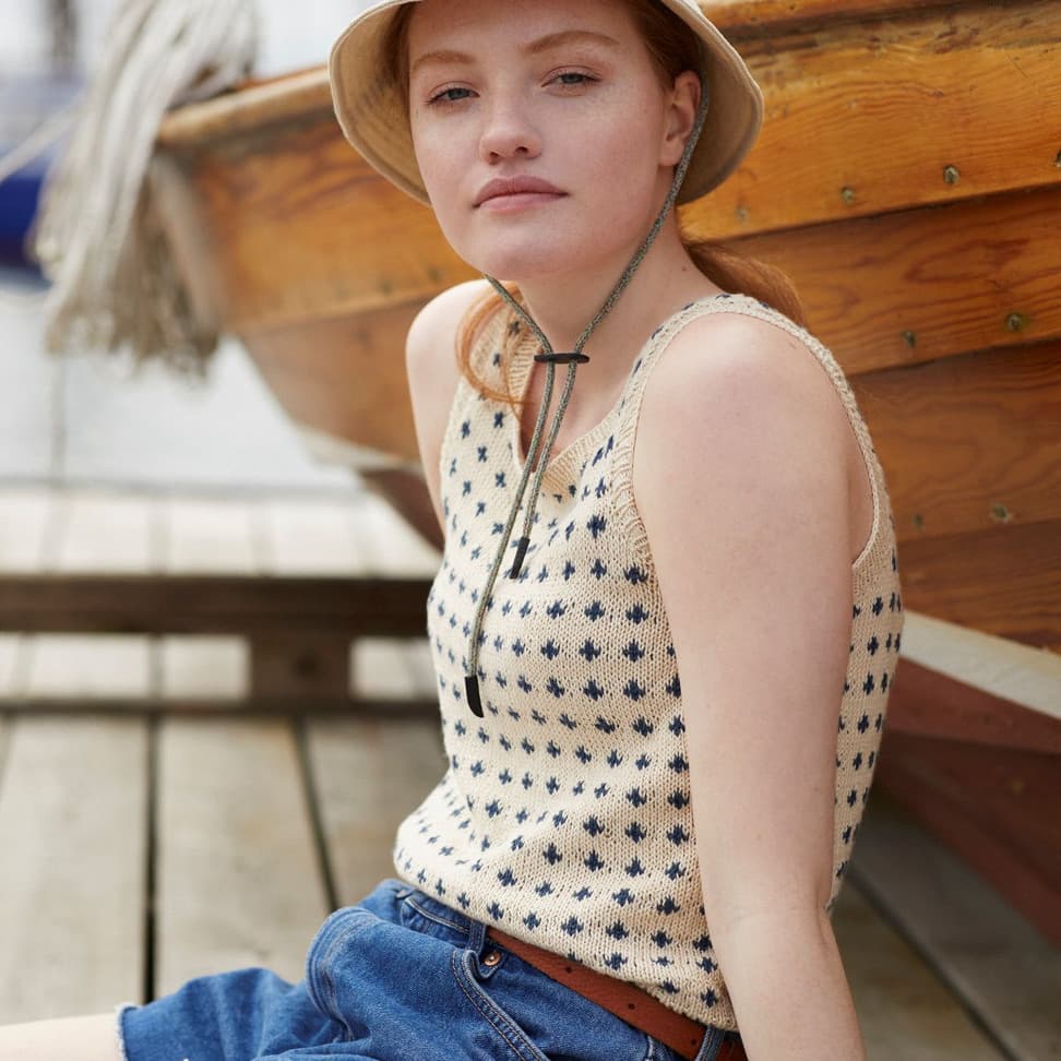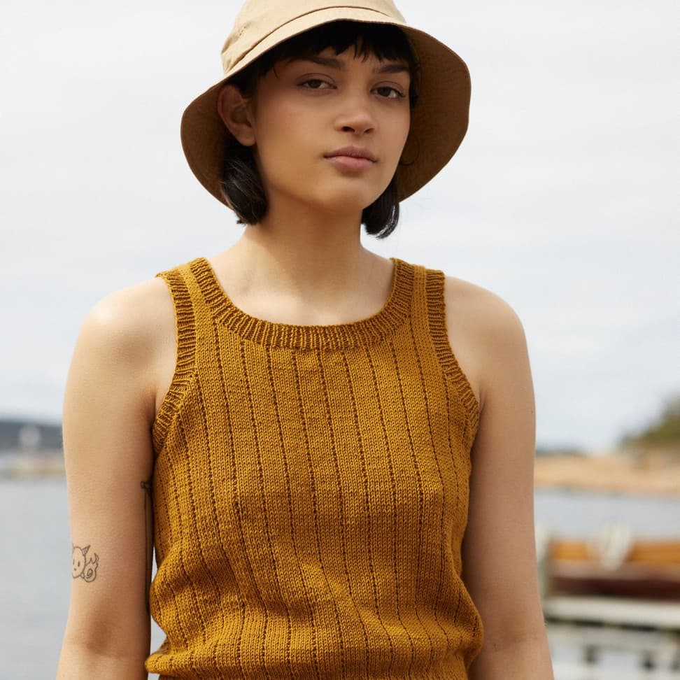 Bygetoppen er en småmønstret topp med rund hals, brede stropper og ribbestrikkede kanter. Toppen er kort og kroppsnær og den strikkes nedenfra og opp. For å få en kroppsnær fasong, strikk en størrelse som er like stor eller ned til 4 cm mindre, enn brystvidden din.