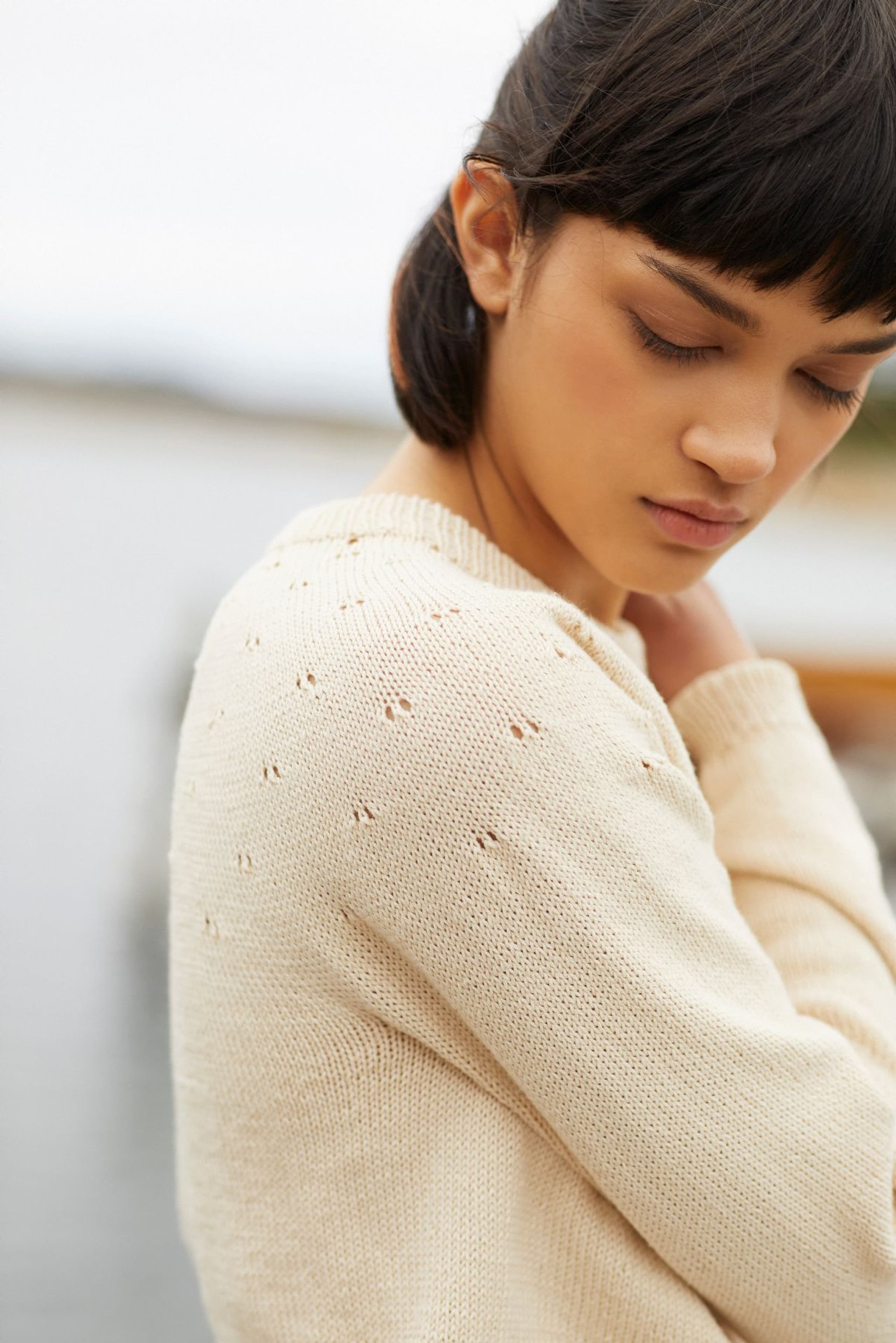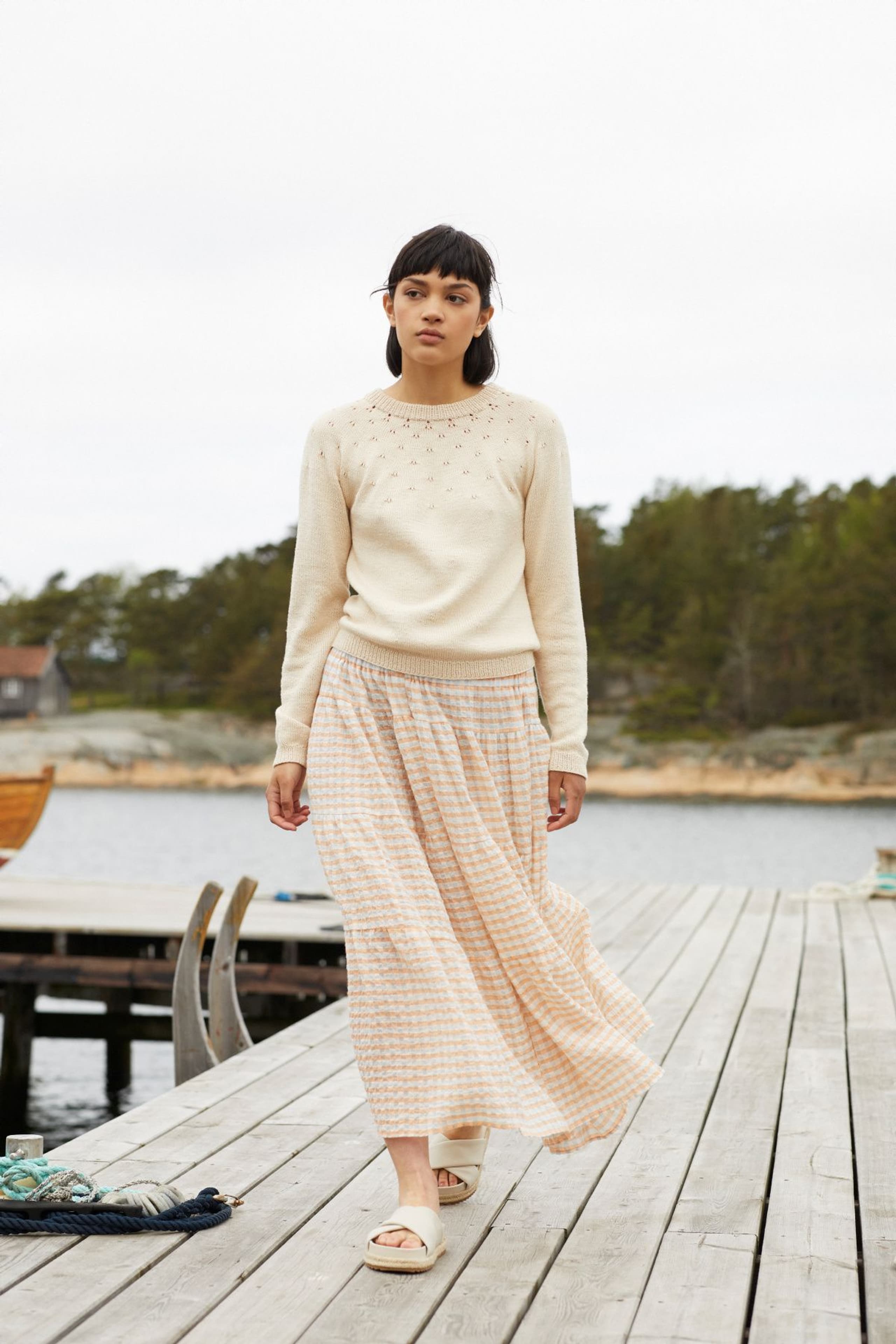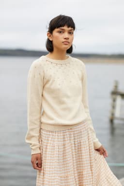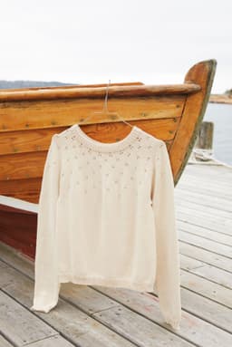 Flimregenser er en søt langermet genser med hullmønstret rundt bærestykke. Modellen har en avslappet rett fasong med ribbestrikkede kanter. Den strikkes ovenfra og ned. For å få en avslappet fasong, strikk en størrelse som er 4-8 cm større enn brystvidden din.