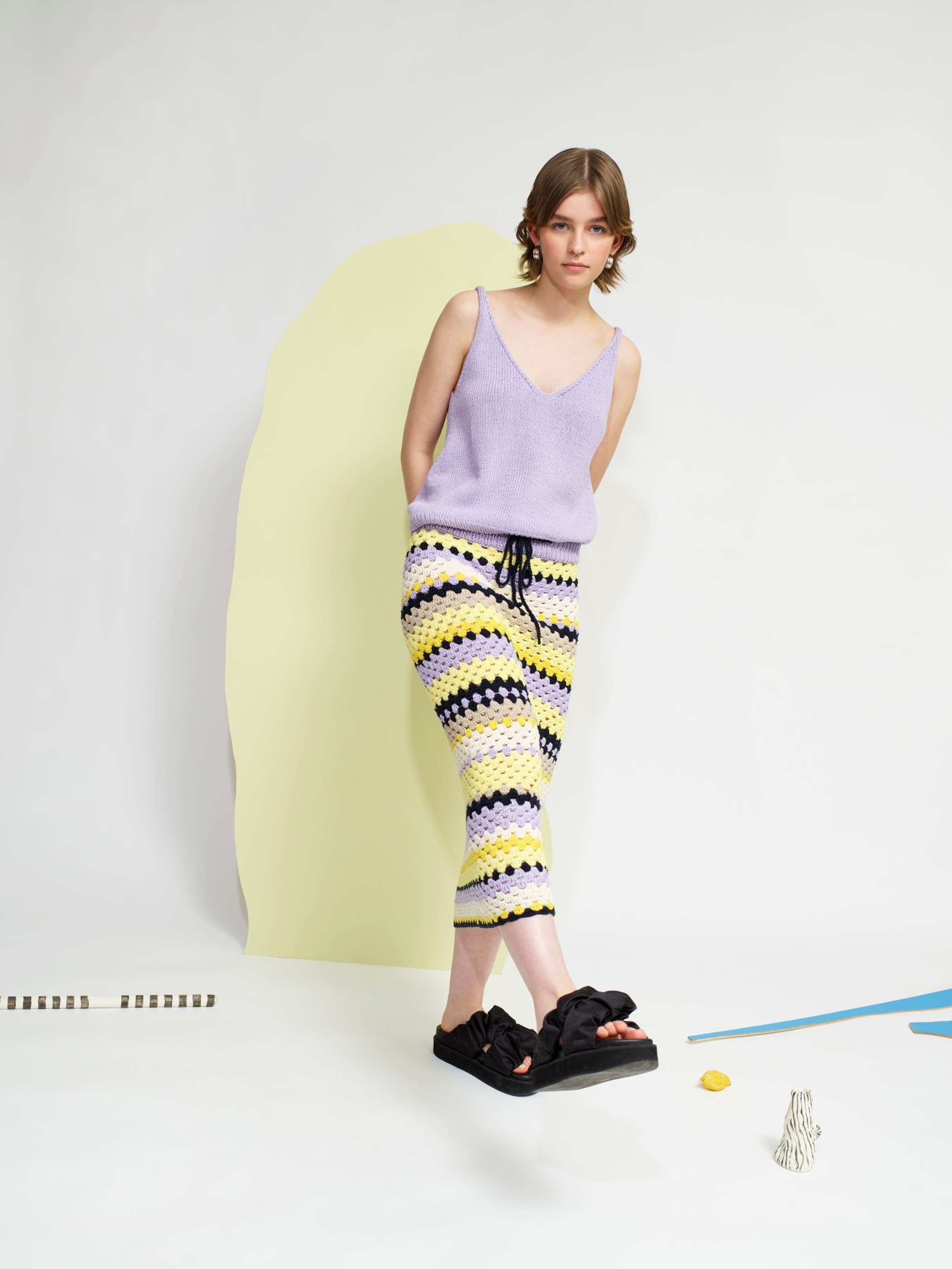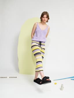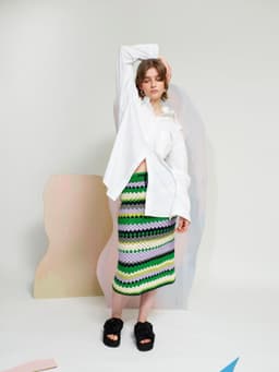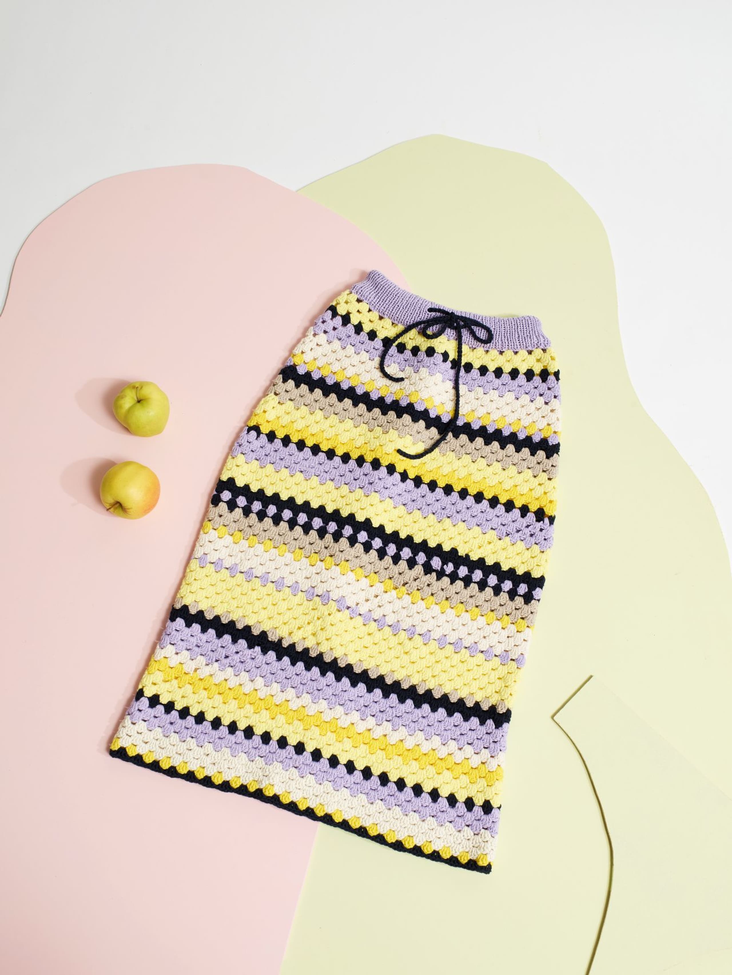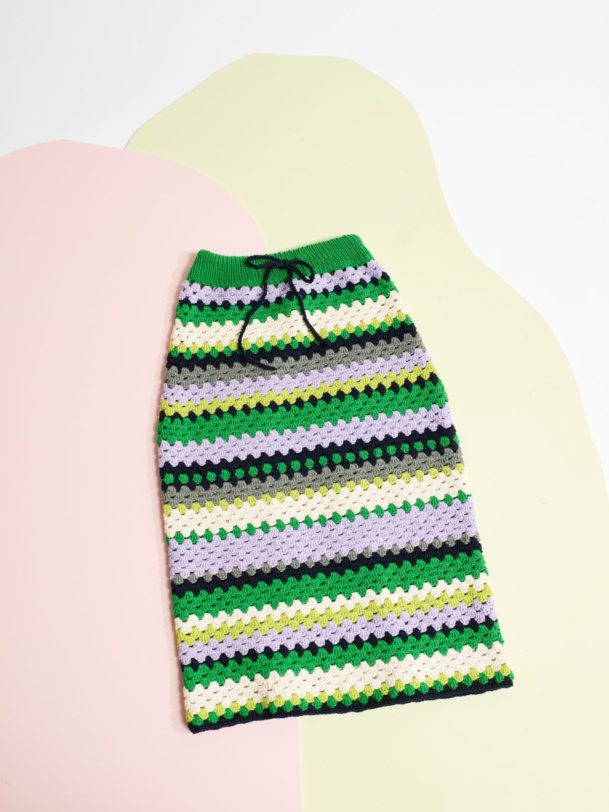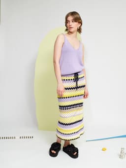 Krokus skjørt er et heklet stripeskjørt med strikket linning og knytesnor i livet. Skjørtet er kroppsnært med en rett fasong og rekker til ca midt på leggen. Det hekles ovenfra og ned og det økes i hver side over hoftene. Siden skjørtet hekles ovenfra, kan lengden enkelt justeres underveis i arbeidet. For å få en kroppsnær fasong, velg en størrelse som har en stussvidde som er like stor eller noen cm større enn din egen stussvidde.
