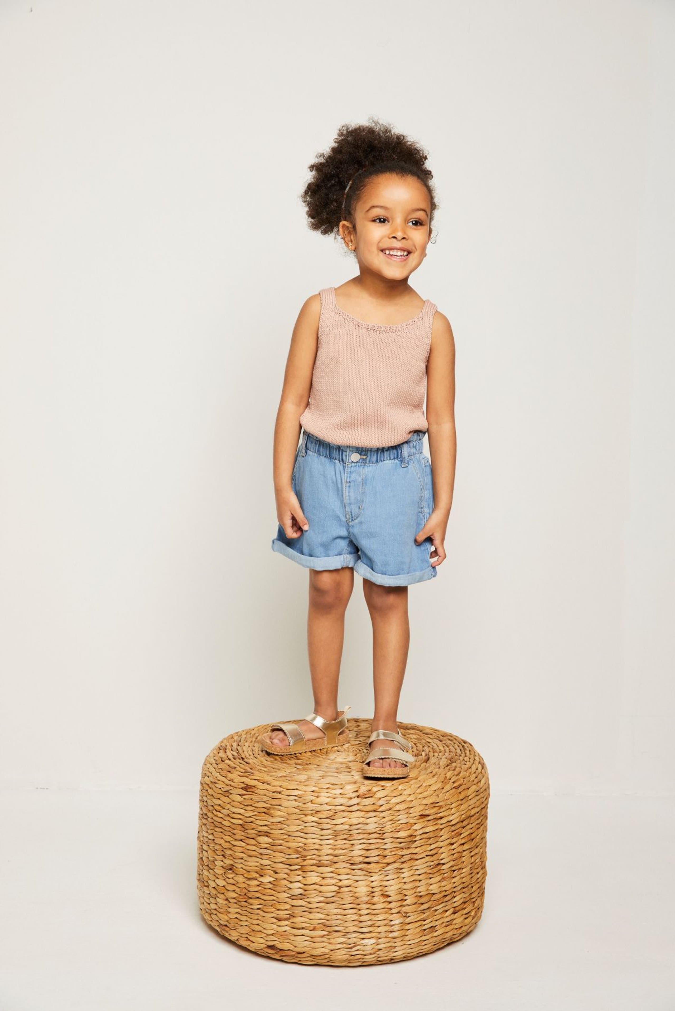 Noor singlet har rund hals, er tettsittende og strikkes nedenfra og opp. For å få en tettsittende fasong, velg en størrelse som har en brystvidde som er like stor eller noen cm mindre enn barnets kropp.