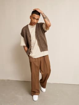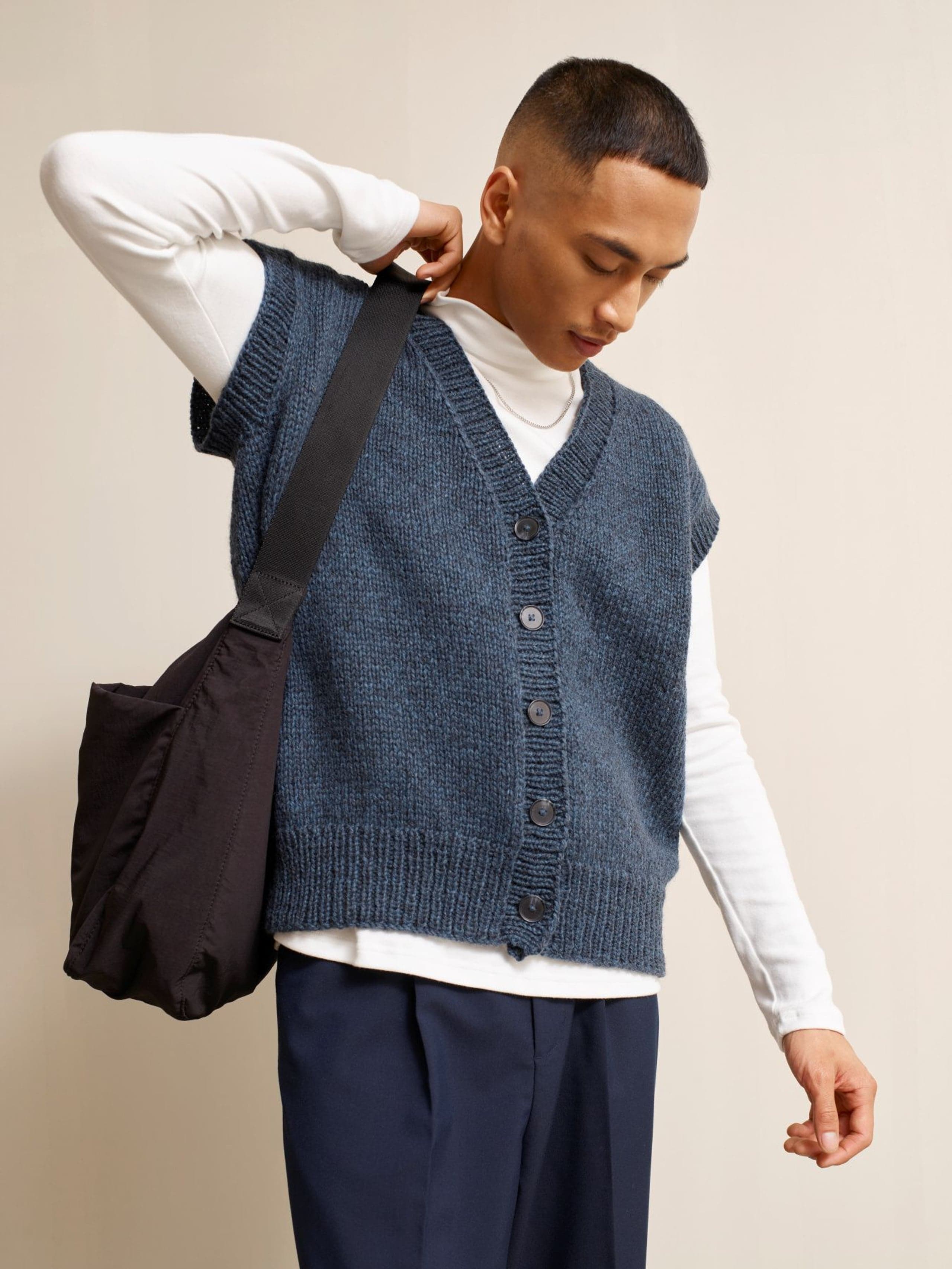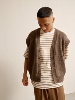 Aslak vest er en glattstrikket vest med ribbestrikkede kanter. Vesten har en rett og ledig passform med v-hals og knapper foran. Den strikkes frem og tilbake, nedenfra og opp. For å få en ledig passform, velg en størrelse som har en brystvidde som er 10-18 cm større enn din egen.