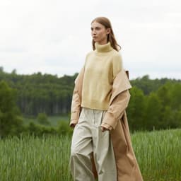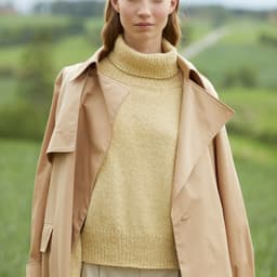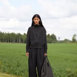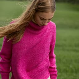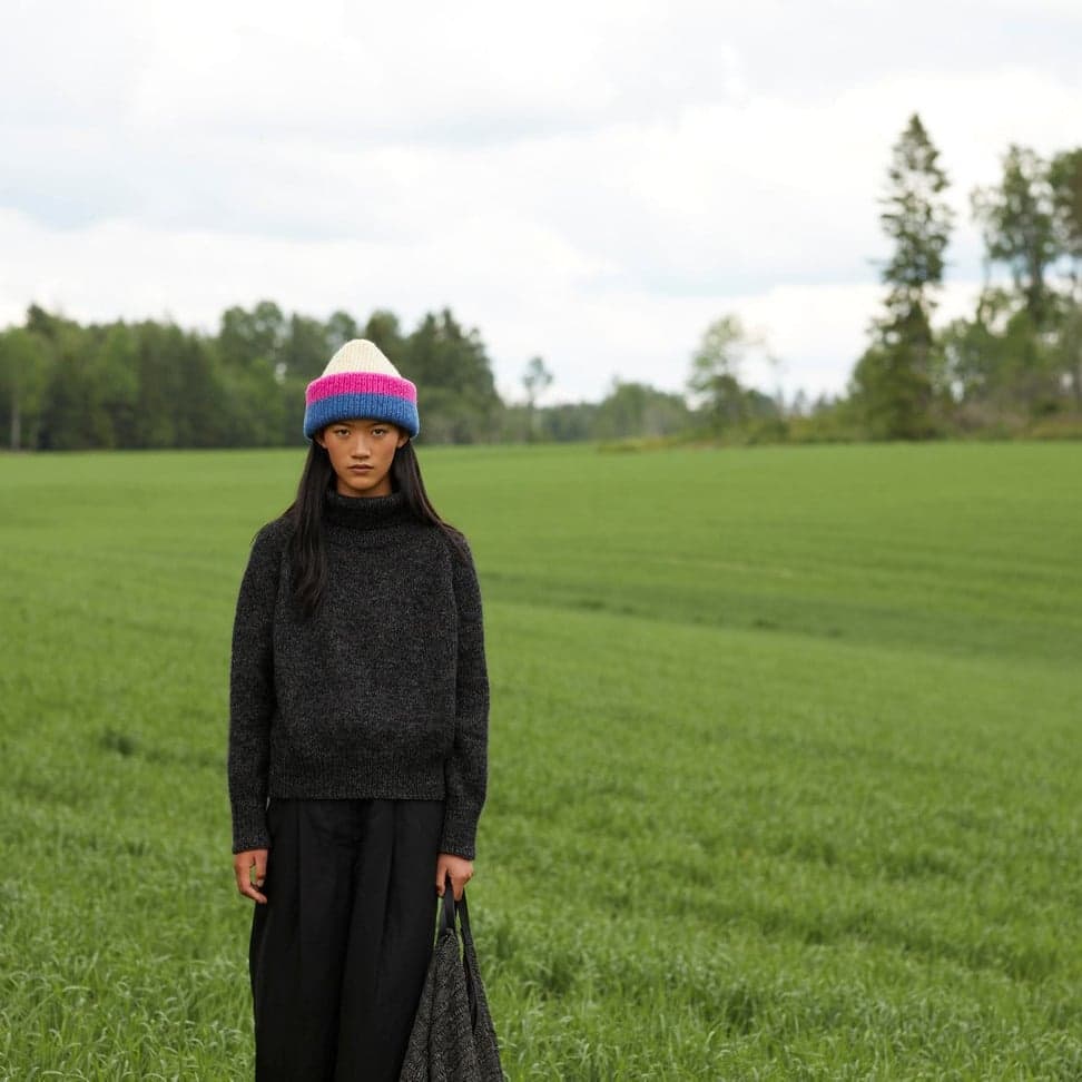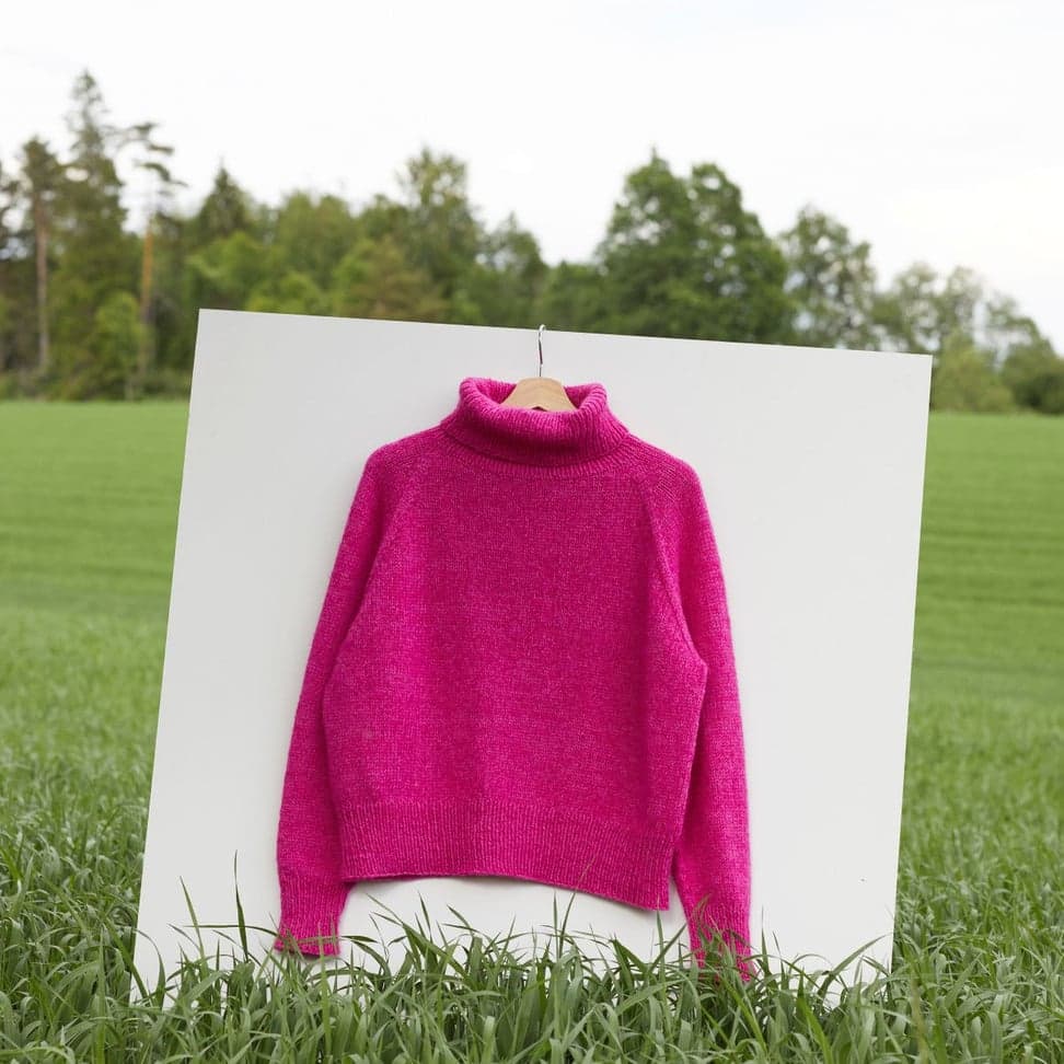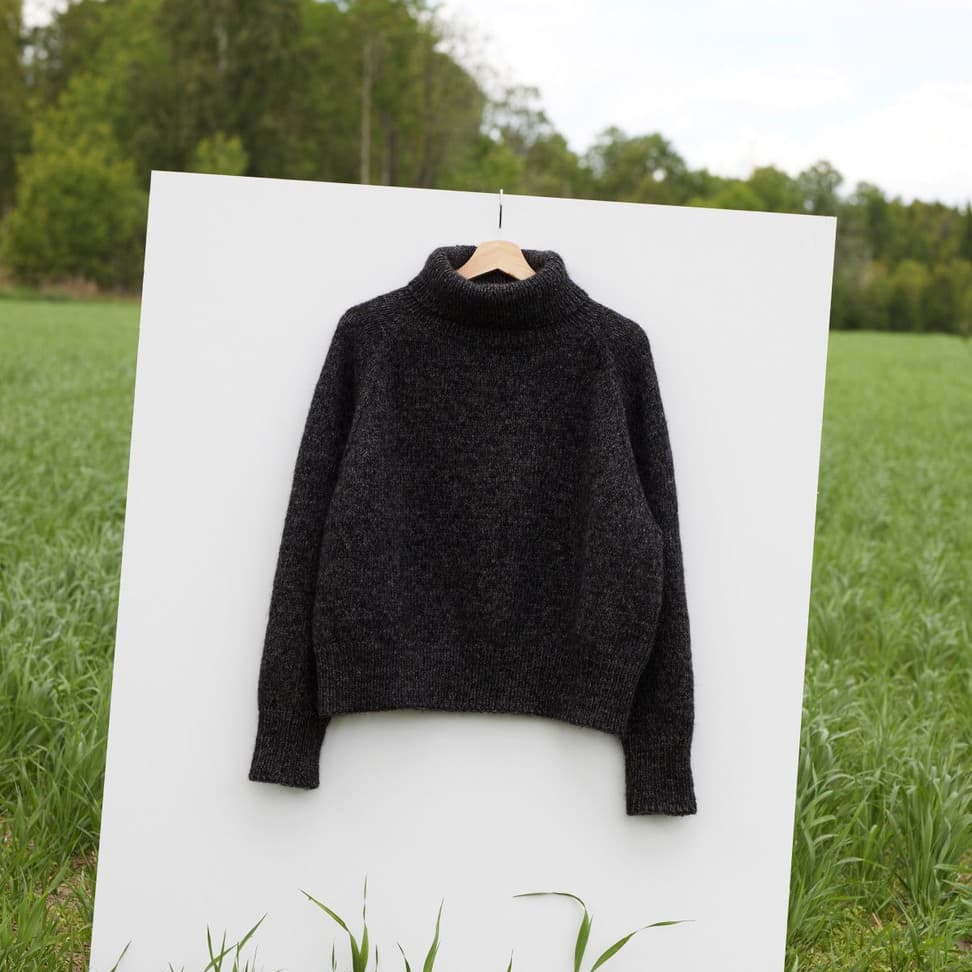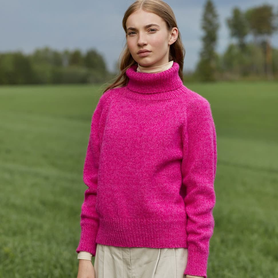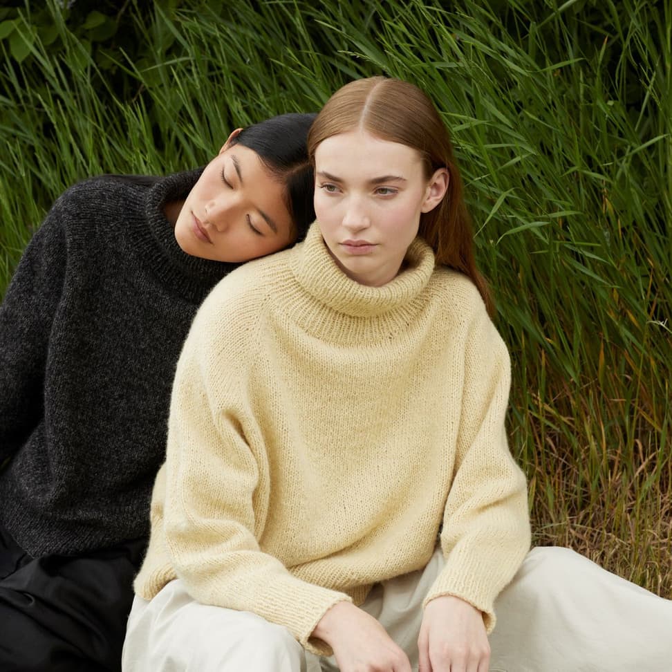 Sesam raglangenser er en oversized, glattstrikket raglangenser med høy hals. Den er kort og rett med lange ribbekanter. Genseren strikkes ovenfra og ned med 1 tråd Finull og 1 tråd Alpaca Silk. Halsringningen formes ved å strikke vendepinner og det økes til raglan på hver side av 3 glattstrikkede m. For å få en oversized passform, velg en størrelse som har en brystvidde som er 20-28 cm større enn din egen.