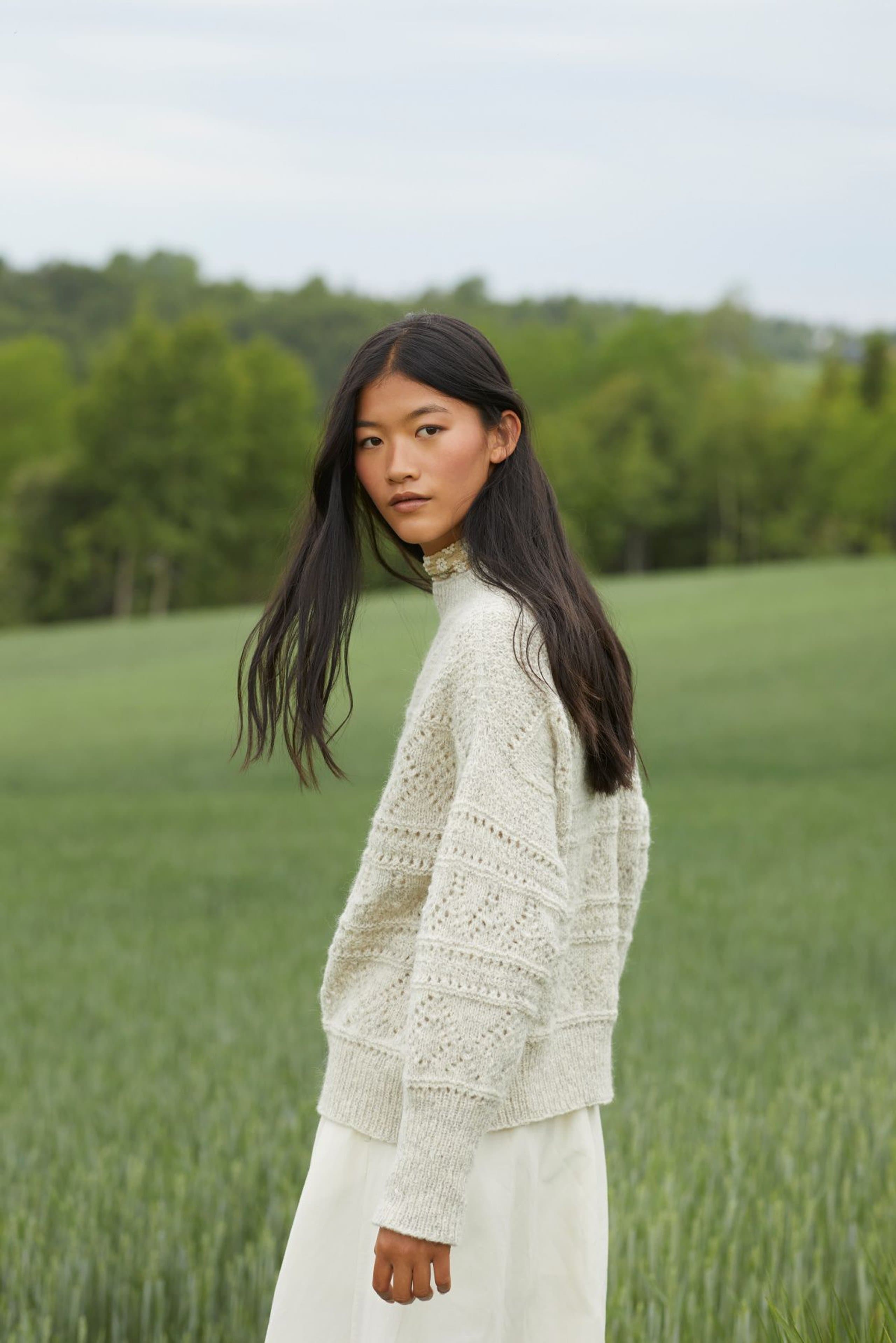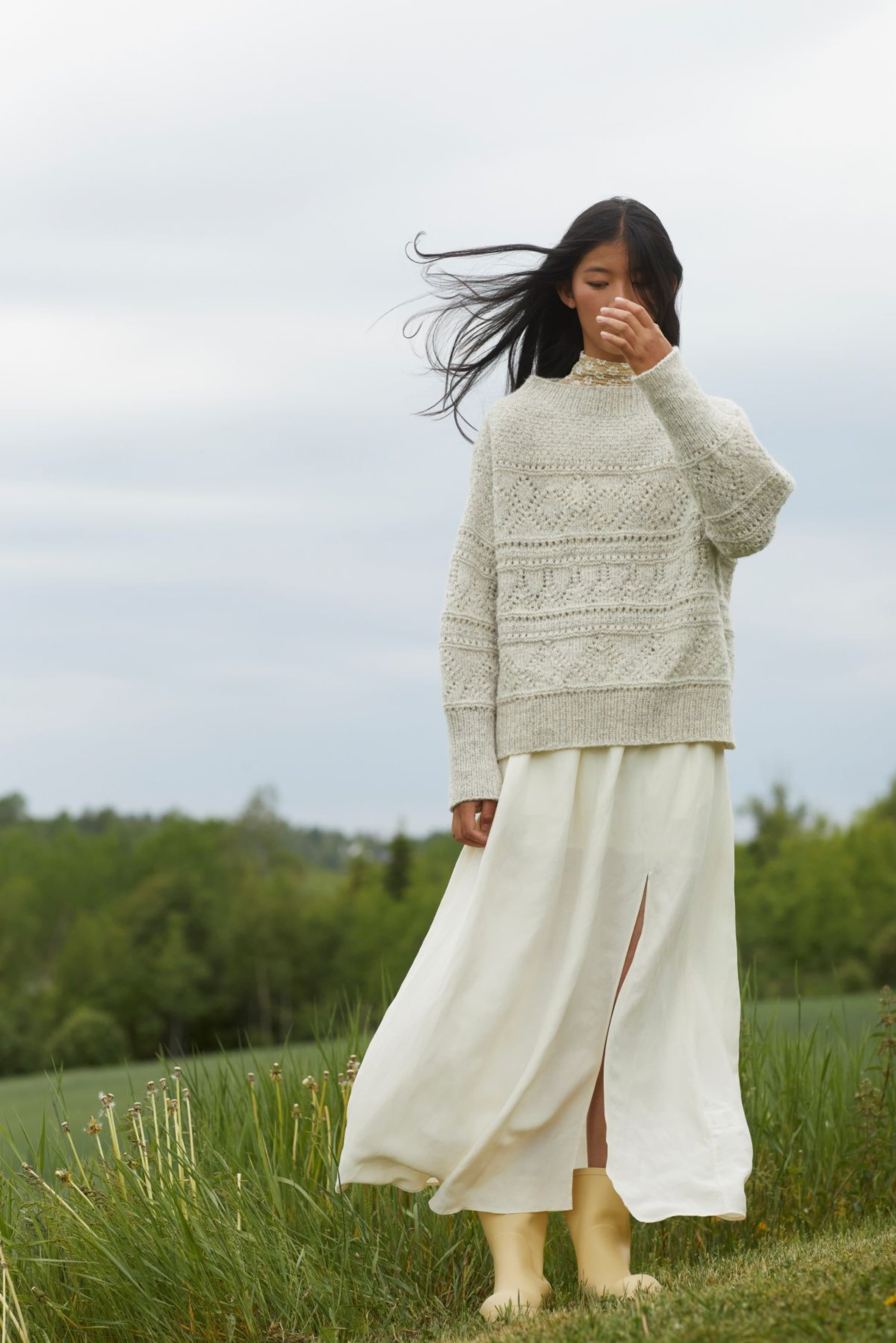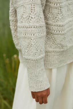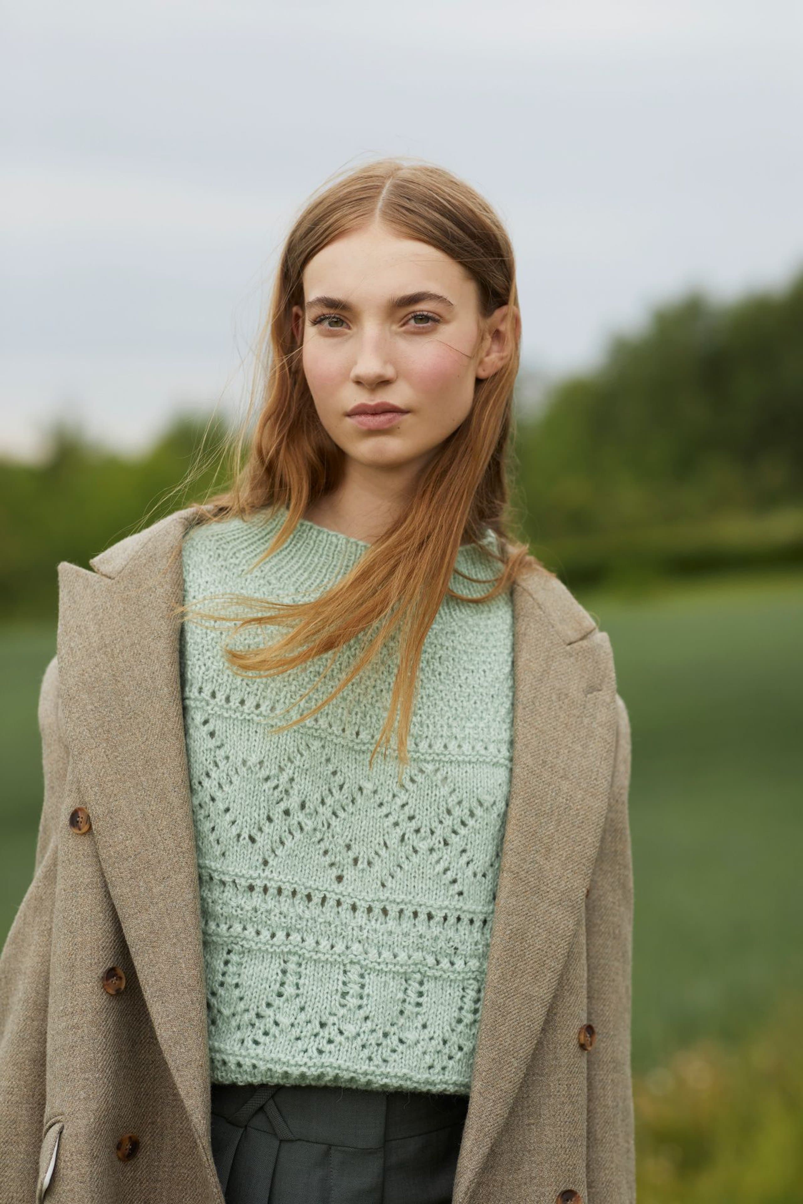 Mynte genser er en oversized genser med border i forskjellige hullmønstre og med ribbestrikkede kanter. Genseren strikkes ovenfra og ned med 1 tråd Finull og 1 tråd Alpaca Silk. Halsringningen formes ved å strikke vendepinner og det økes til skrå skuldre på hver side av 3 skulder-m. Ermene plukkes opp rundt ermehullene og strikkes nedover. For å få en oversized passform, velg en størrelse som har en brystvidde som er 20-28 cm større enn din egen.