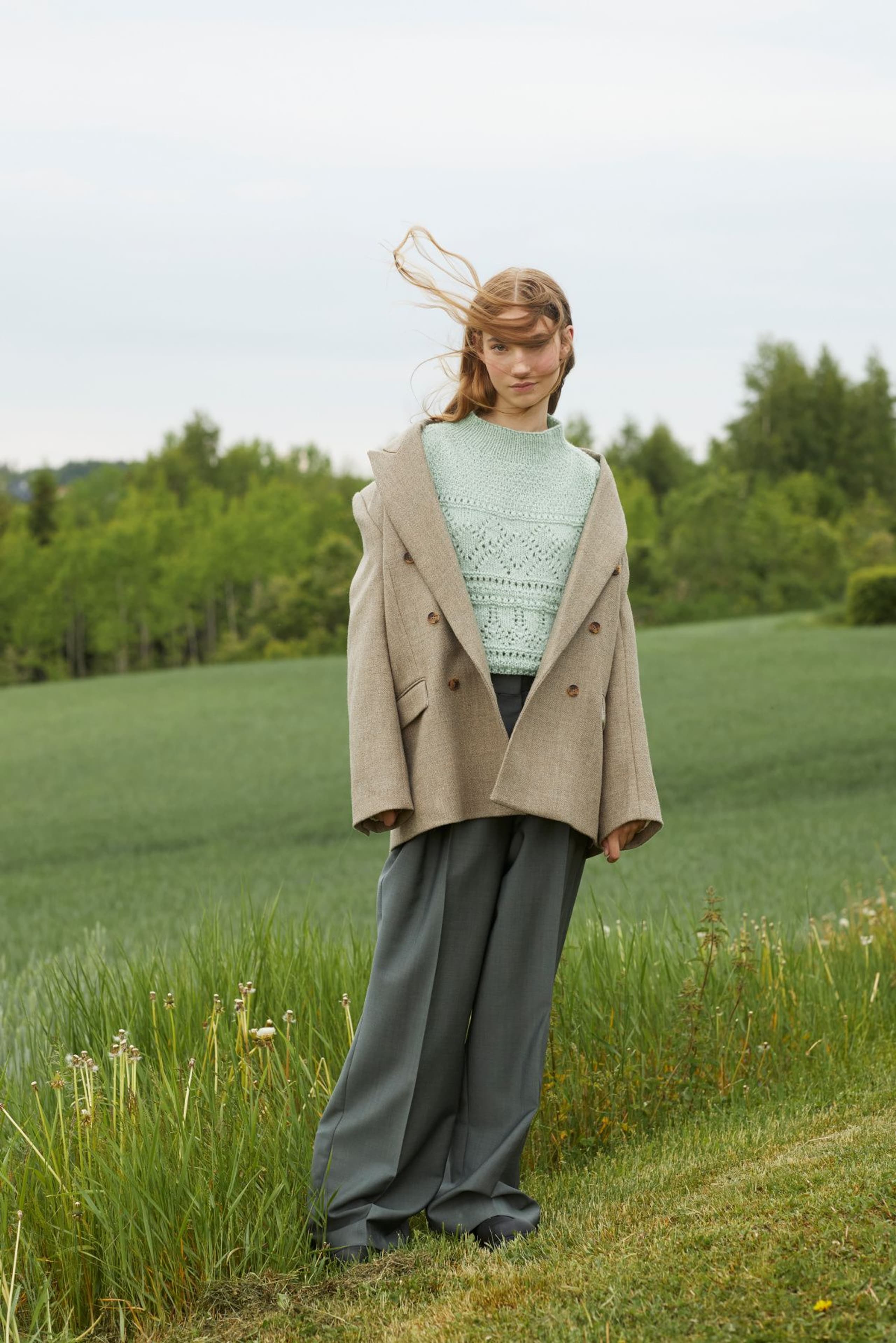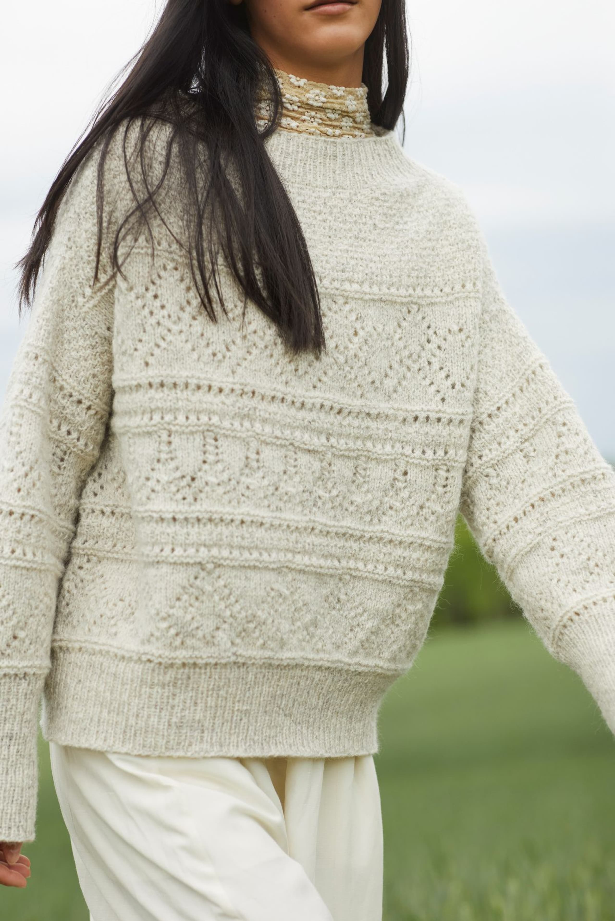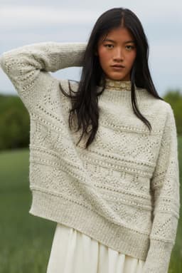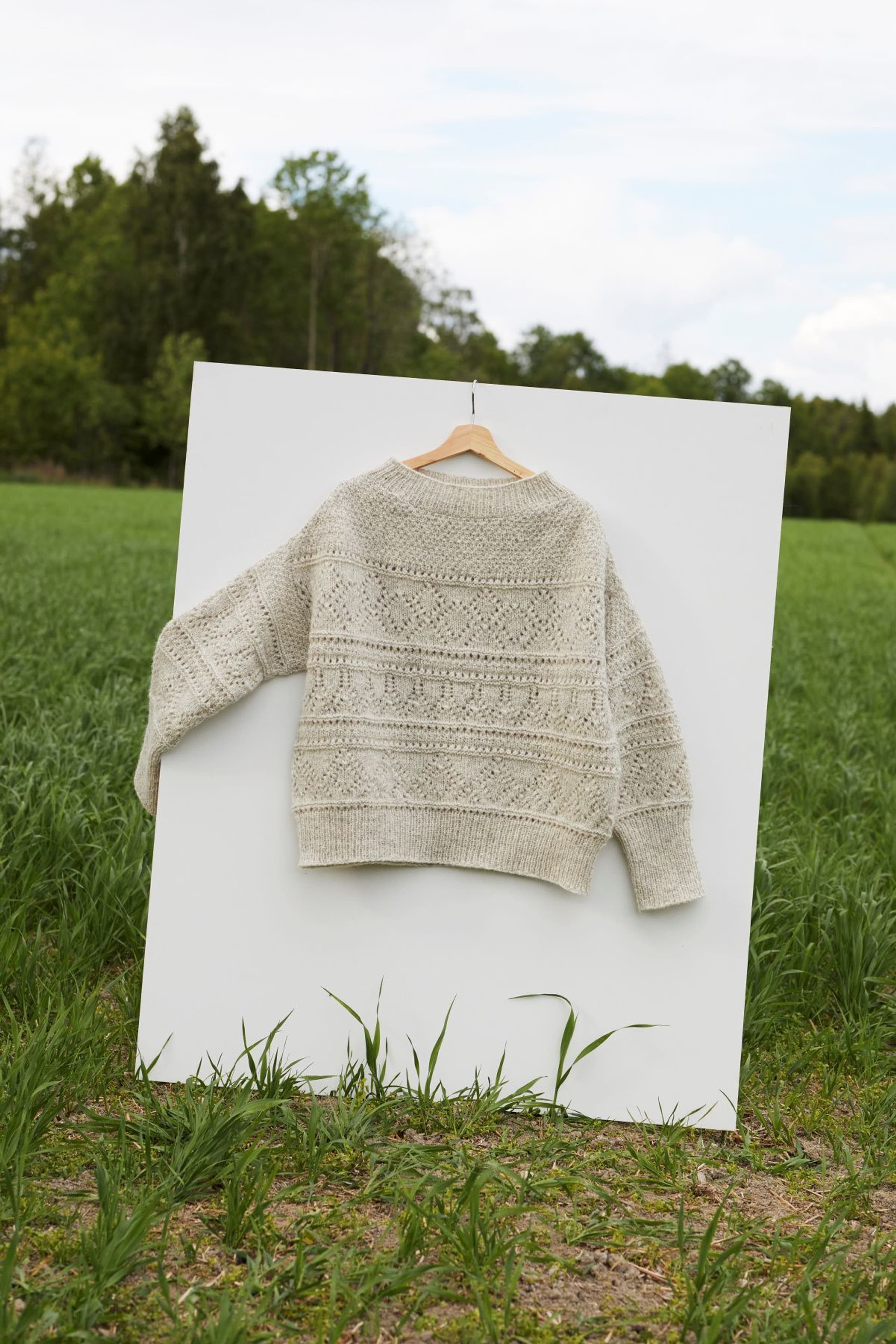 Mynte genser er en oversized genser med border i forskjellige hullmønstre og med ribbestrikkede kanter. Genseren strikkes ovenfra og ned med 1 tråd Finull og 1 tråd Alpaca Silk. Halsringningen formes ved å strikke vendepinner og det økes til skrå skuldre på hver side av 3 skulder-m. Ermene plukkes opp rundt ermehullene og strikkes nedover. For å få en oversized passform, velg en størrelse som har en brystvidde som er 20-28 cm større enn din egen.