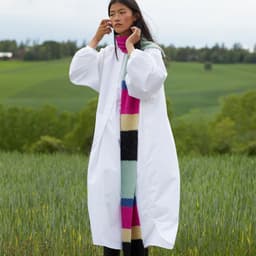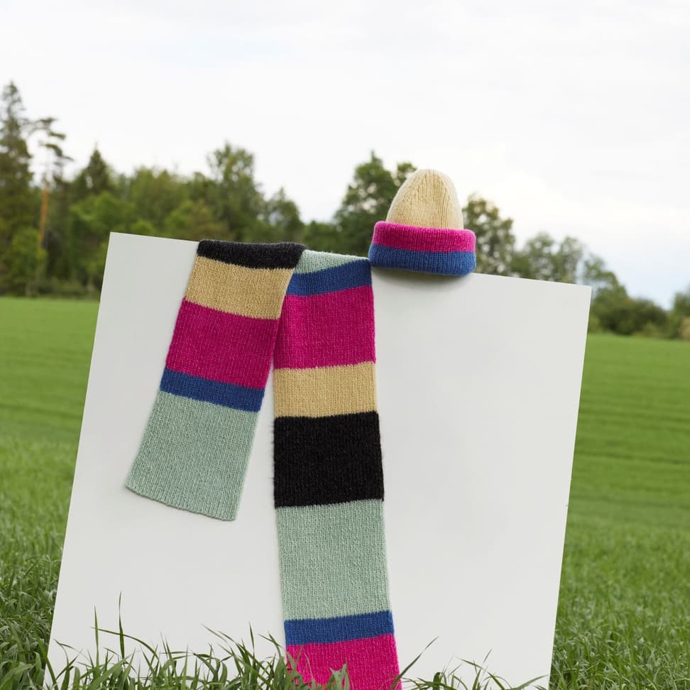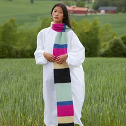 Felice ribbeskjerf strikkes i striper i fem farger med 1 tråd Finull og 1 tråd Alpaca Silk. Det er langt og kan snurres både en og to ganger rundt halsen.