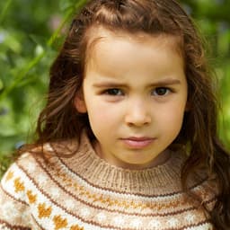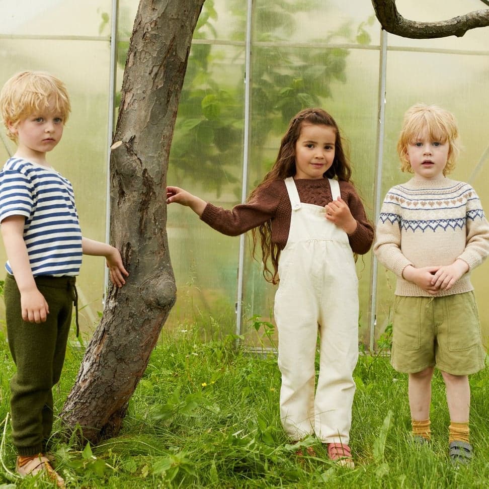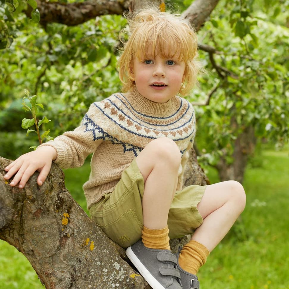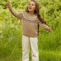 Trollheggenseren er en klassisk genser med rund hals, mønstret bærestykke og ribbestrikkede kanter. Genseren strikkes ovenfra og ned, lengden på bol og ermer kan derfor lett tilpasses til annen lengde. For å få en ledig fasong, velg en størrelse som har en brystvidde som er 6-10 cm større enn barnets.