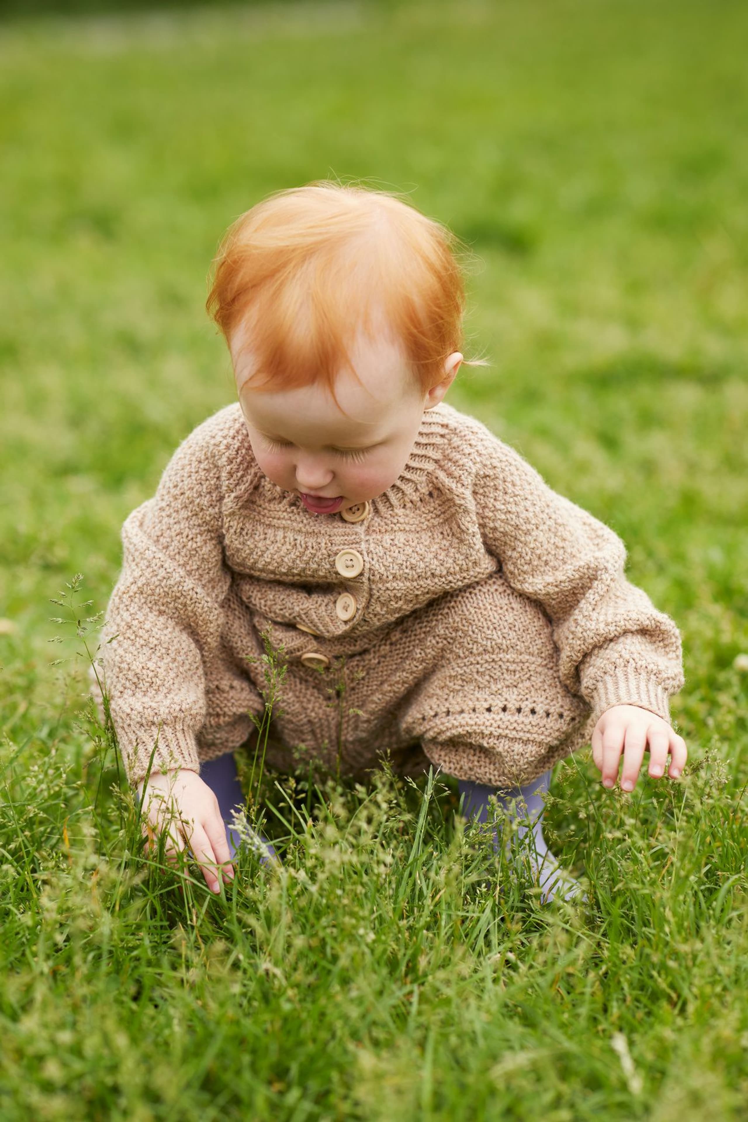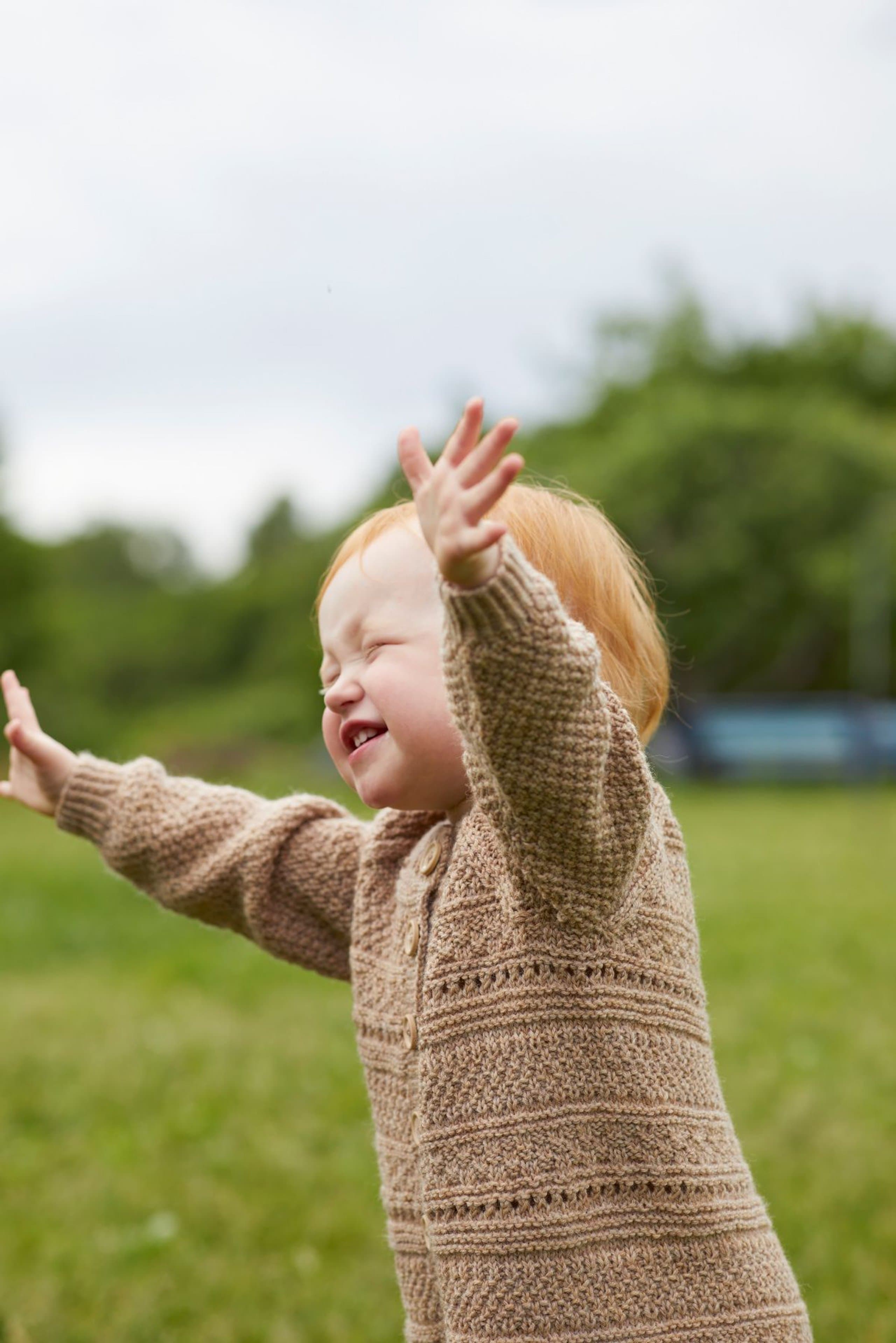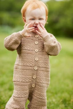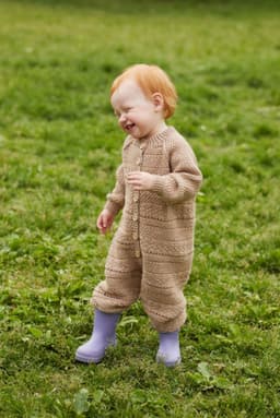 Kobbelobbedressen er en strukturmønstret dress med raglan, rund hals og åpning med knapper foran. Dressen strikkes nedenfra og opp med border i strukturmønster på bolen og perlestrikk på ermene. For å få en ledig fasong, velg en størrelse som har en brystvidde som er ca 6-10 cm større enn barnets.