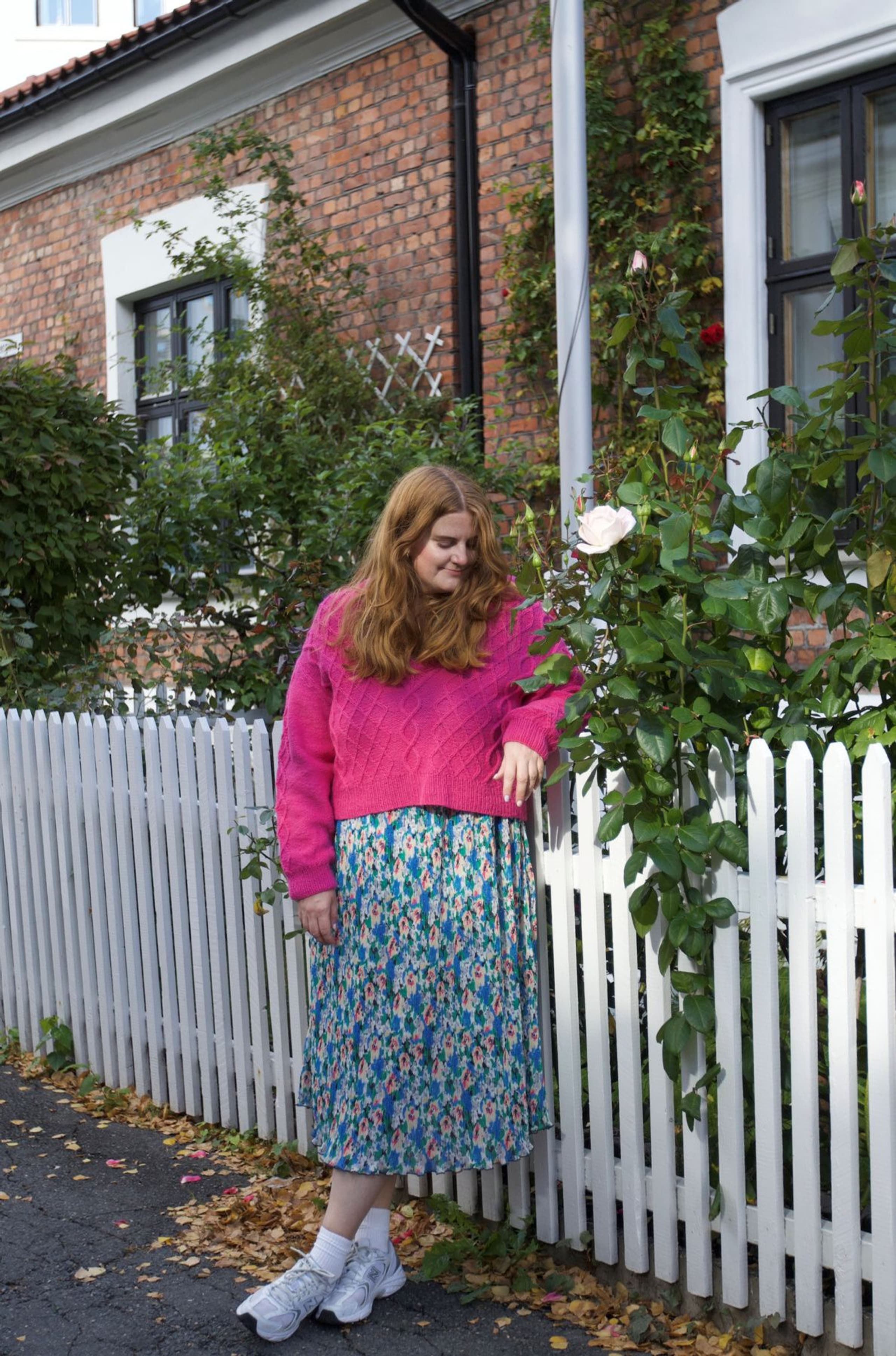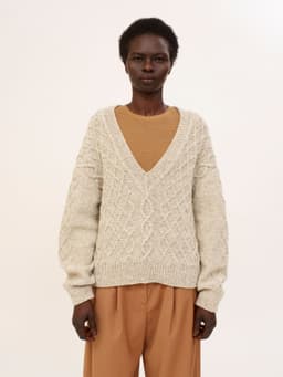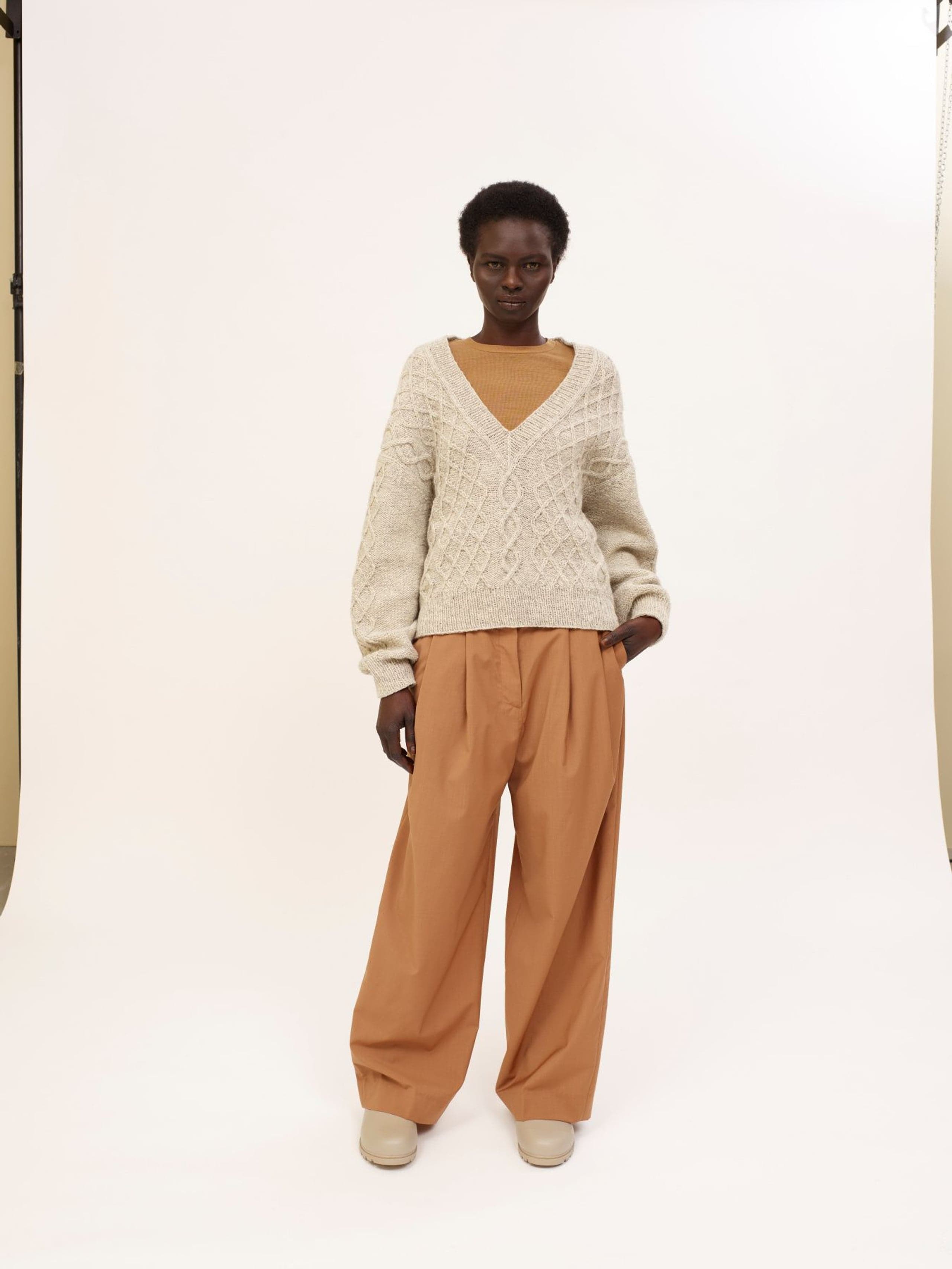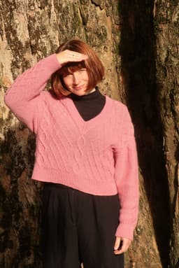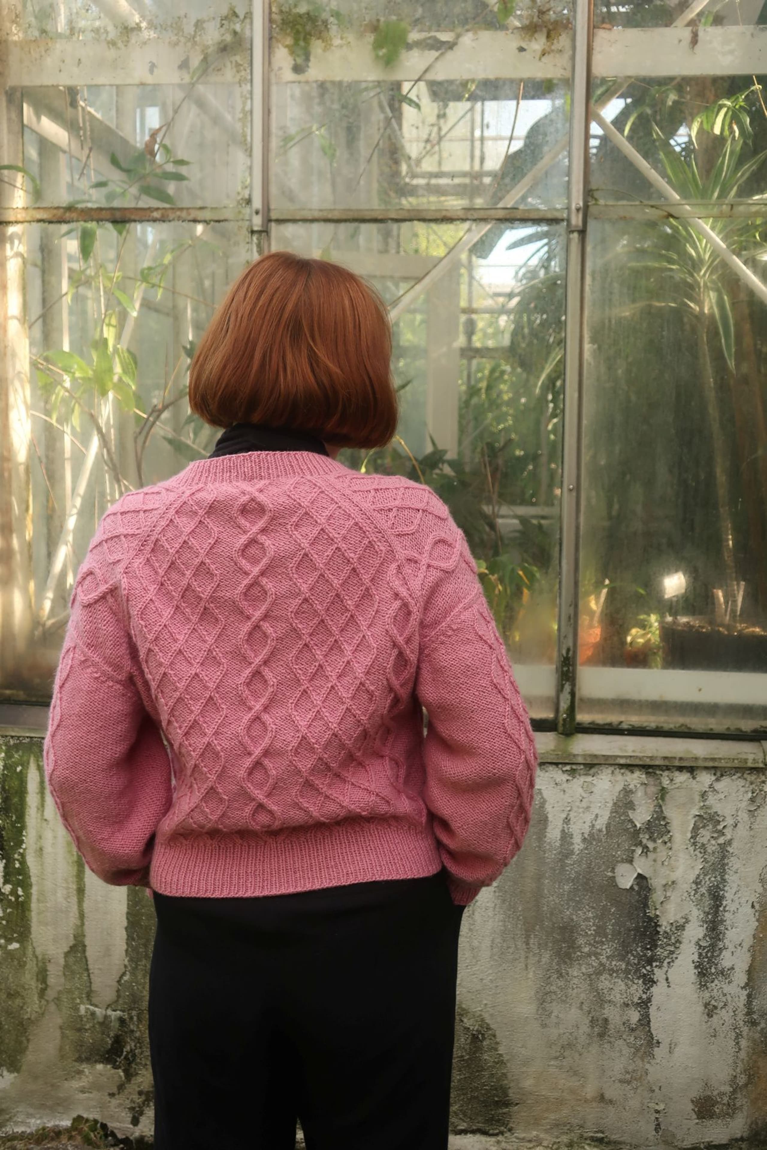 Genseren strikkes ovenfra og ned. Først strikkes bakstykket frem og tilbake med økninger til skuldrene. Så plukker man opp m langs skulderen og strikker den ene siden av forstykket frem og tilbake mens man øker til v-hals. Så strikker man den andre siden av forstykket på samme måte før alle delene settes inn på samme p og arbeidet fortsetter rundt. Hele genseren strikkes med flettemønster. Masker til ermene plukkes opp rundt ermehullet og ermet strikkes nedover. Ermetoppen formes med vendepinner. Fremstrikkerne kan ha gjort egne justeringer på plaggene de har strikket som å forkorte eller forlenge ermer og bol. **Kjøp magasinet uten garn her:** [422 Fremstrikk magasin](https://www.raumagarn.no/produkt/tilbehor/fremstrikk-2)