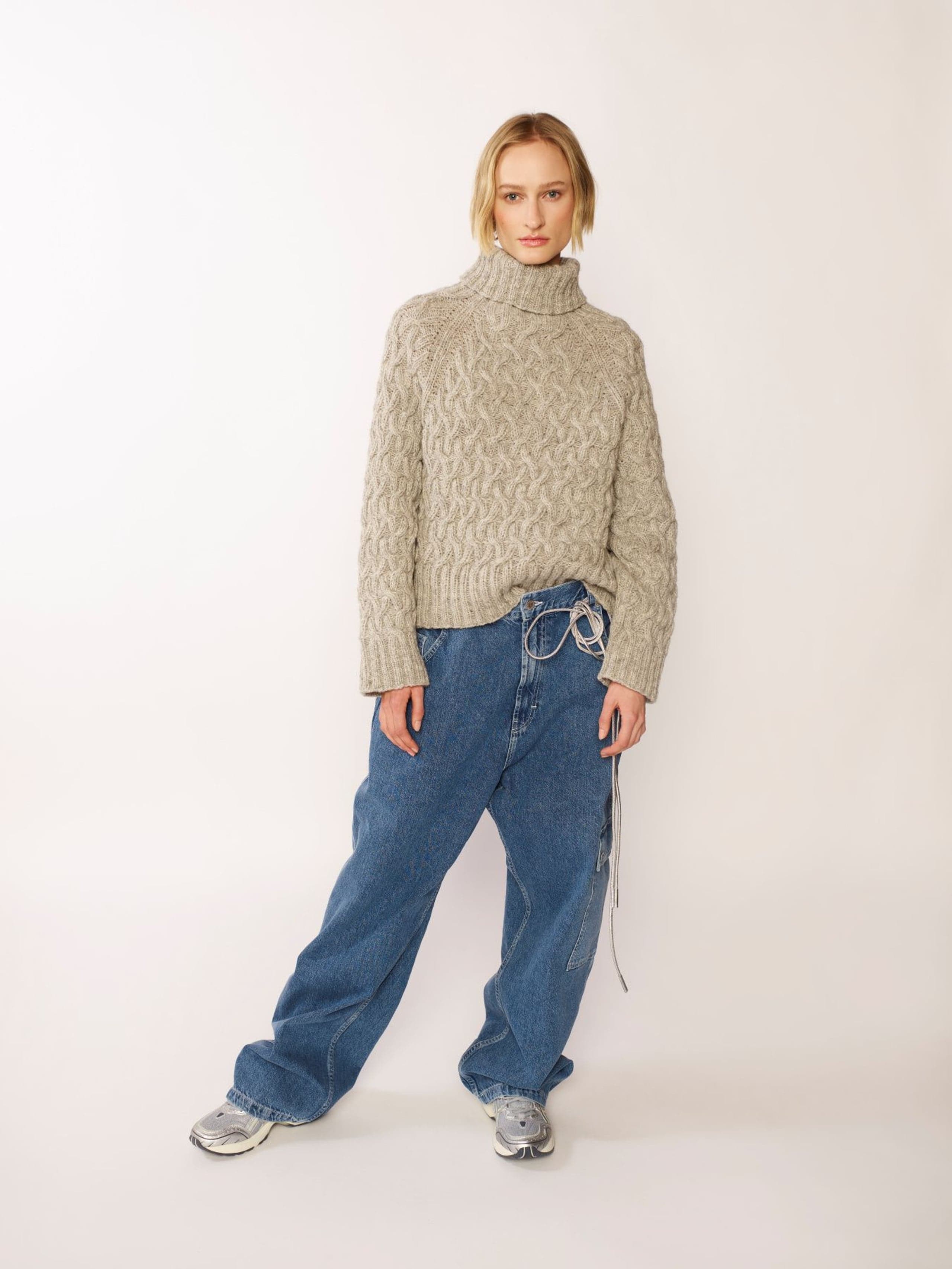 Florens flettegenser er en raglangenser i flettestruktur. Den har en klassisk passform med høy hals og ribbestrikkede kanter. Genseren strikkes ovenfra og ned. Halsringningen formes ved å strikke vendepinner, og det økes til raglan på hver side av 6 ribbestrikkede m. For å få en avslappet passform, velg en størrelse som har en brystvidde som er 10-16 cm større enn din egen.