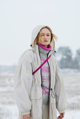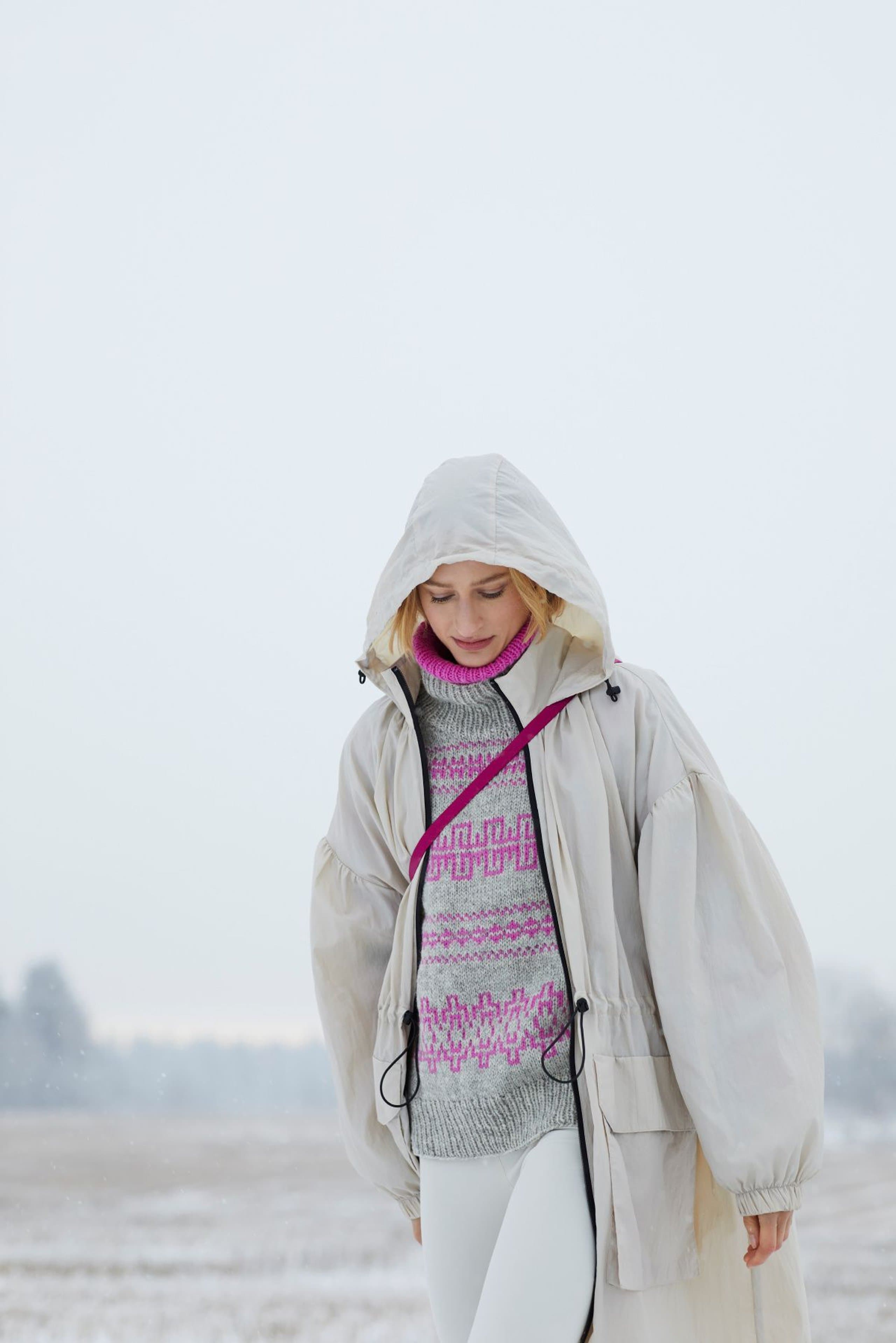 Fjære genser er mønstret i to farger. Den har en avslappet passform med raglan, rund hals og ribbestrikkede kanter. Genseren strikkes ovenfra og ned. Halsringningen formes ved å strikke vendepinner, og det økes til raglan på hver side av 3 raglan-m. For å få en oversized passform, velg en størrelse som har en brystvidde som er 20-28 cm større enn din egen. Ønsker du å skape et mer spennende uttrykk på Fjære genser, kan du strikke mønsteret med én tråd Tjukk Mohair.