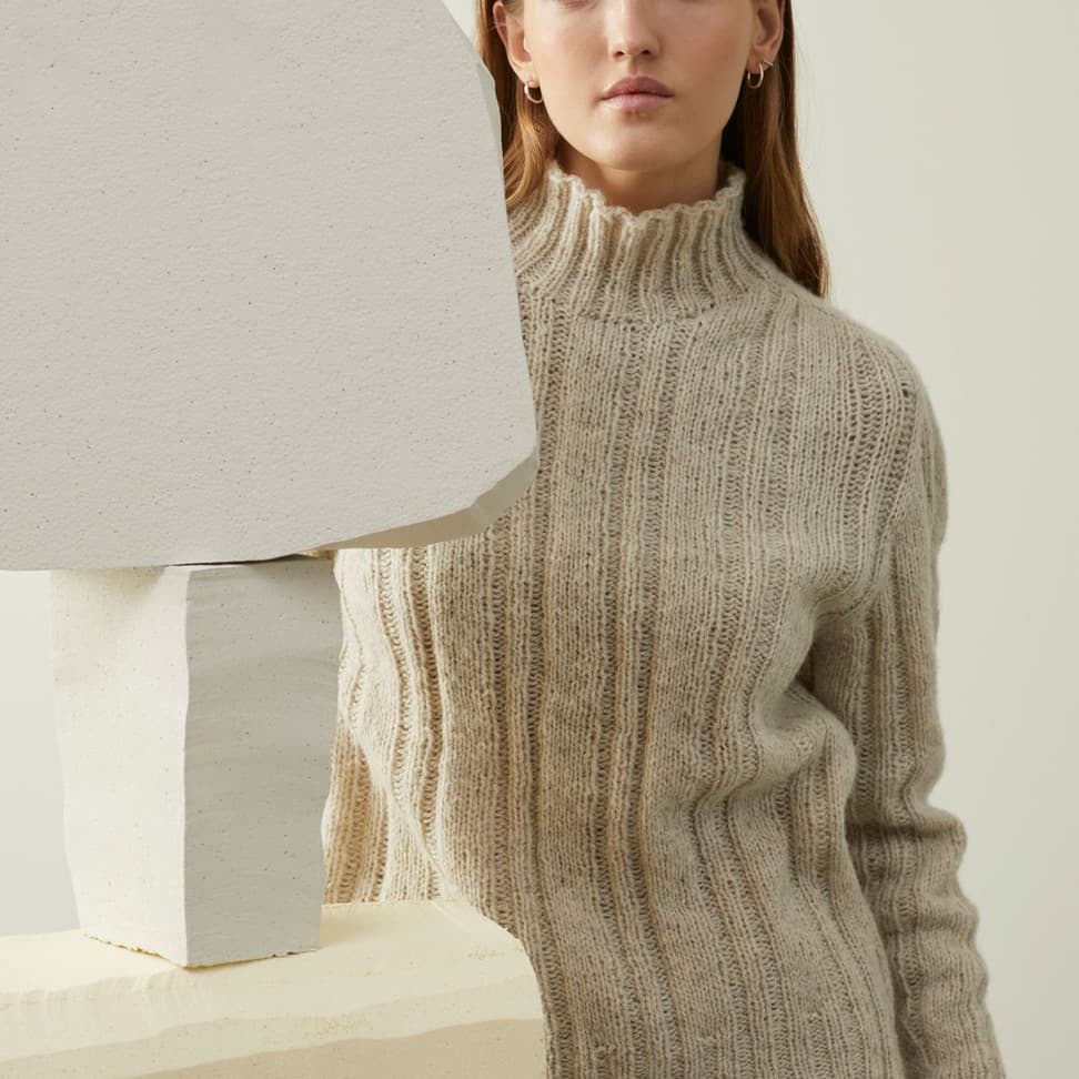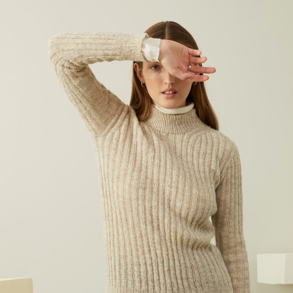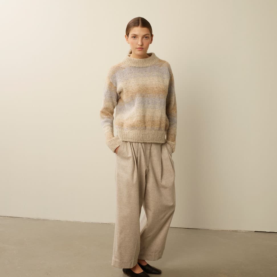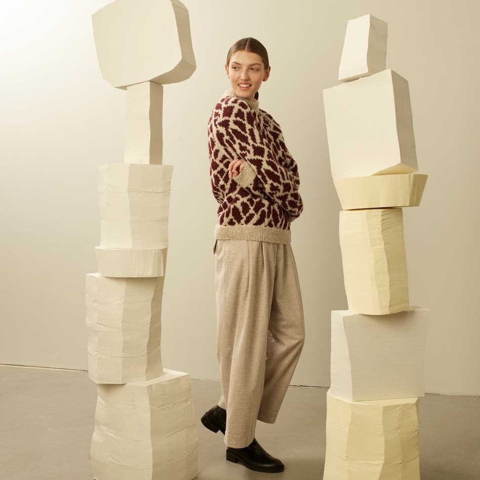 Calatheagenser er en helmønstret raglangenser med klassisk passform, rund hals og ribbestrikkede kanter. Mønsteret er artig å strikke, men også litt utfordrende siden mønsterrapporten er både stor og uregelmessig. Genseren strikkes nedenfra og opp med 1 tråd Finull sammen med 1 tråd Alpaca Silk. Først strikkes bol og ermer hver for seg, før de strikkes sammen oppover med raglanfelling. På grunn av den store mønsterrapporten finnes oppskriften kun i fire størrelser. For å få en klassisk passform, velg en størrelse som har en brystvidde som er 6-10 cm større enn din egen.