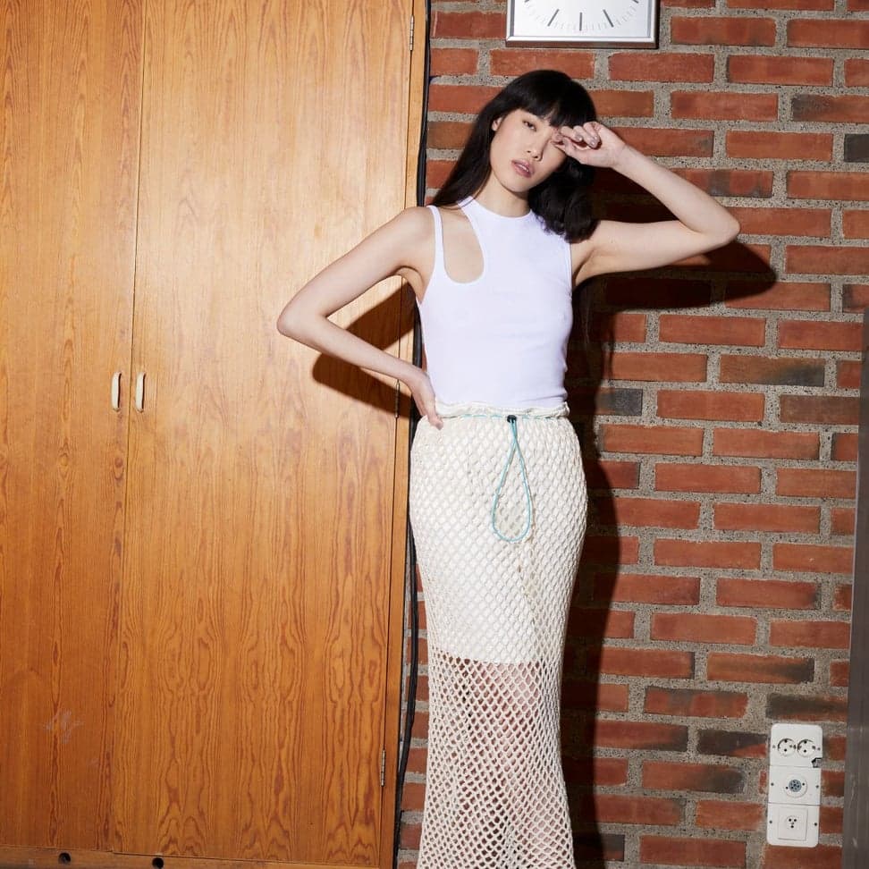 Pacific skjørt hekles ovenfra og ned med et hullmønster av luftmaskebuer. Hekle det ankel-langt eller til ønsket lengde. Skjørtet blir svært tøyelig i alle retninger og vil forme seg etter kroppen. Velg en størrelse med et liv-mål som du klarer å tre på deg – enten ovenfra eller nedenfra. Din egen stussvidde bør ha et mål som ligger mellom «stussvidde» og «stussvidde når strukket i bredden», da vil skjørtet tilpasse seg din fasong. Livvidden tilpasses med en strikk eller et bånd som tres inn i hullene øverst på skjørtet. Bruk skjørtet f.eks over en sykkelshorts eller et satengskjørt.