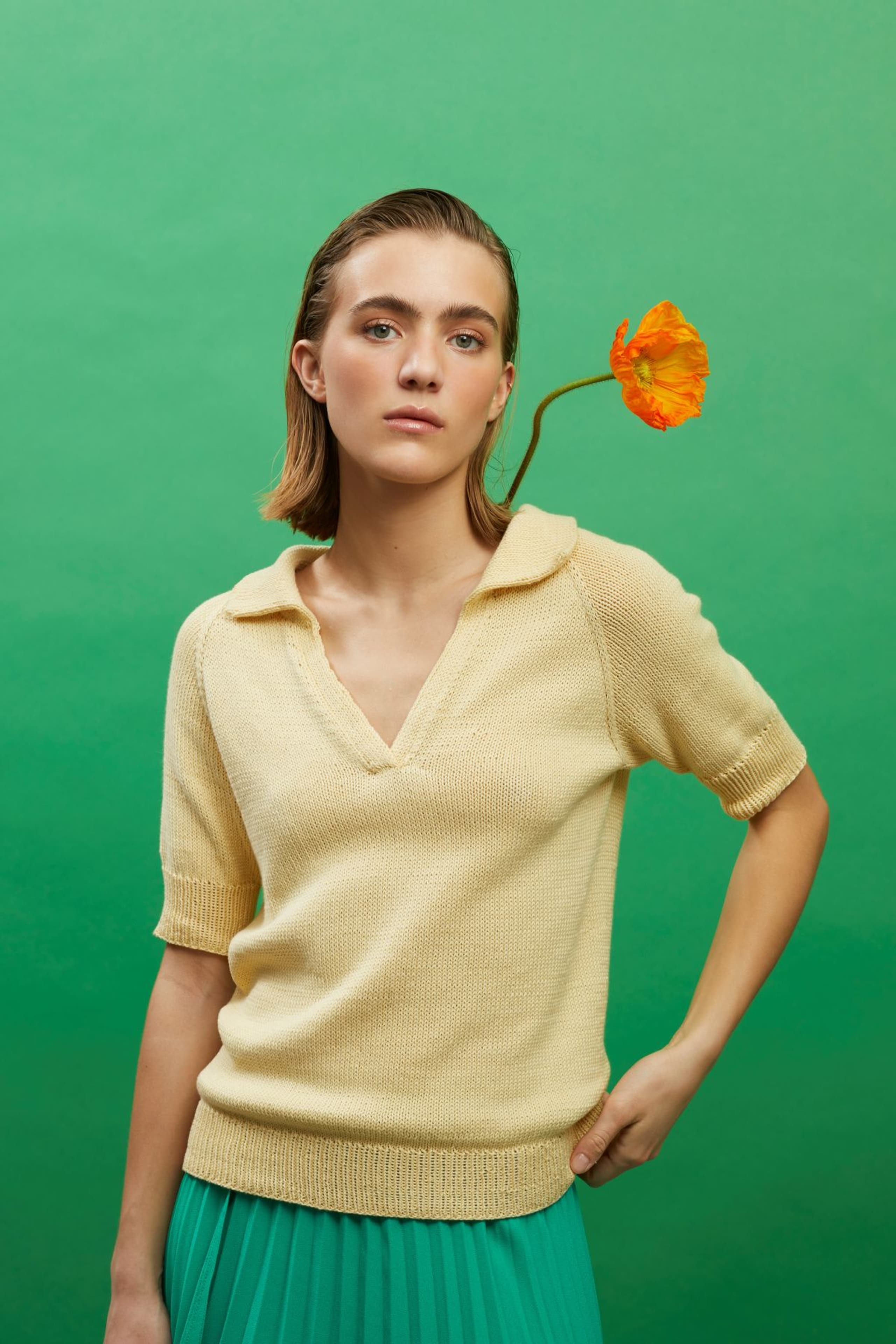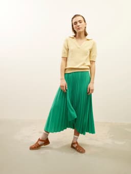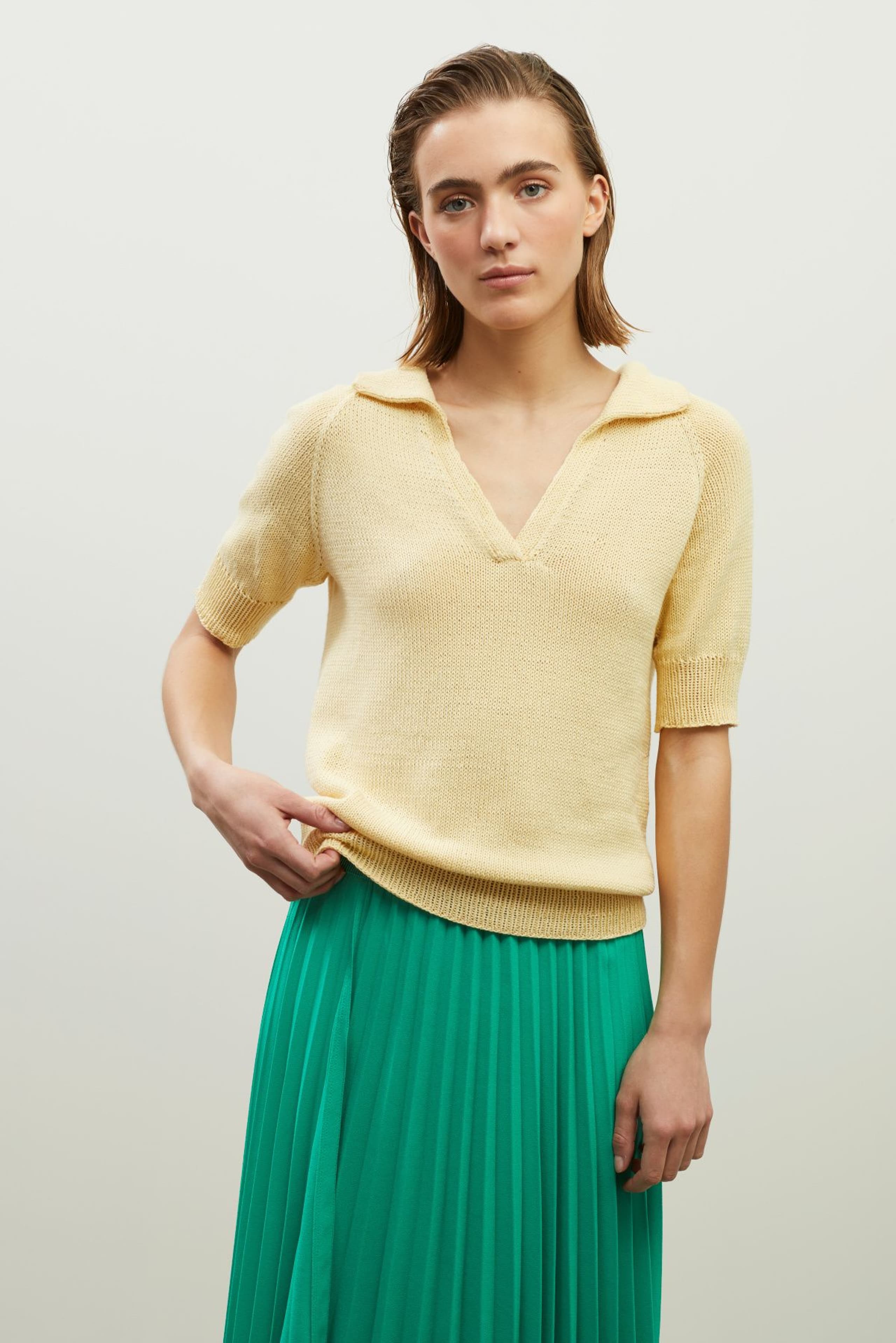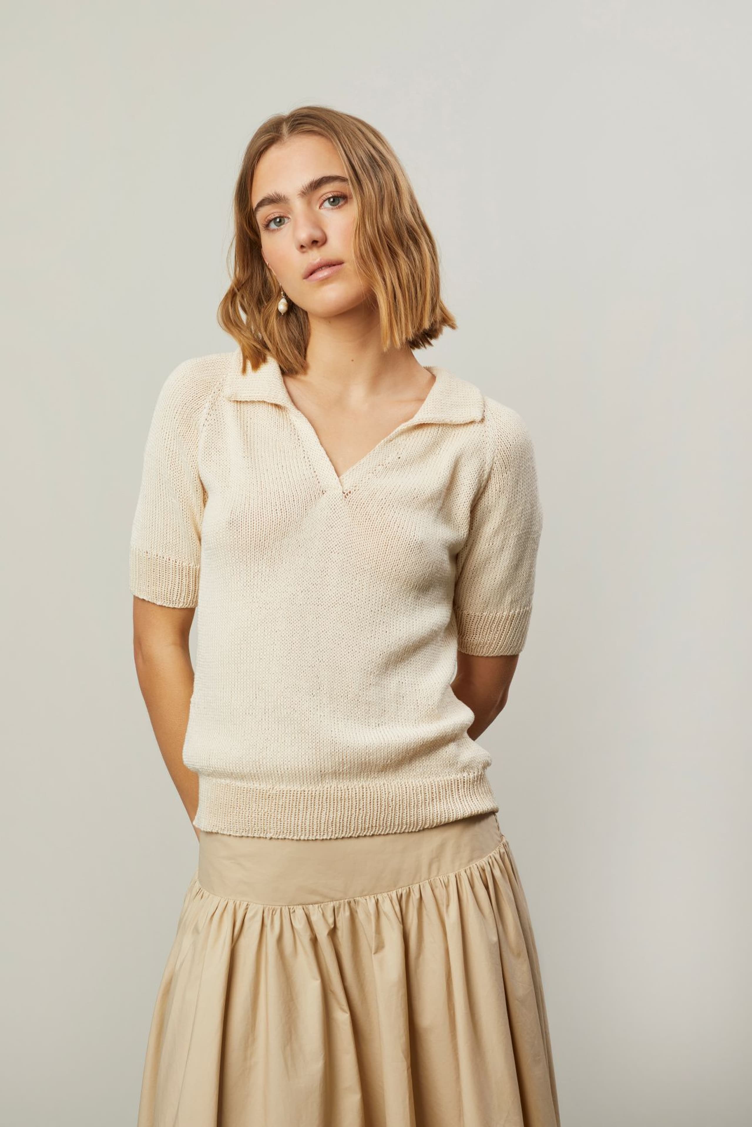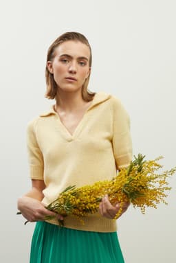 Viola t-skjorte er en glattstrikket t-skjorte med krage og åpning foran. Den strikkes ovenfra og ned med raglanøkinger. Først strikkes kragen dobbel, med teknikken tyrkisk opplegg. Deretter strikkes bærestykket frem og tilbake med vendepinner, og det økes samtidig til raglan og til v-hals. Etter halsøkningene strikkes først kanter foran, og deretter deles arbeidet inn i ermer og bol, og hver del strikkes videre rundt hver for seg og avsluttes med ribbekanter.