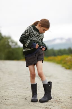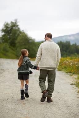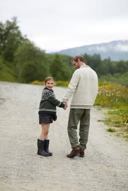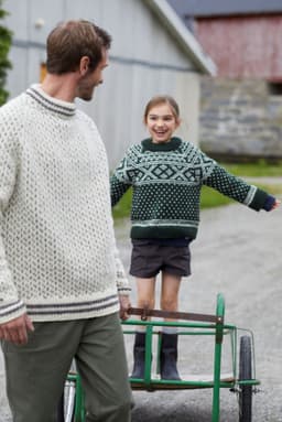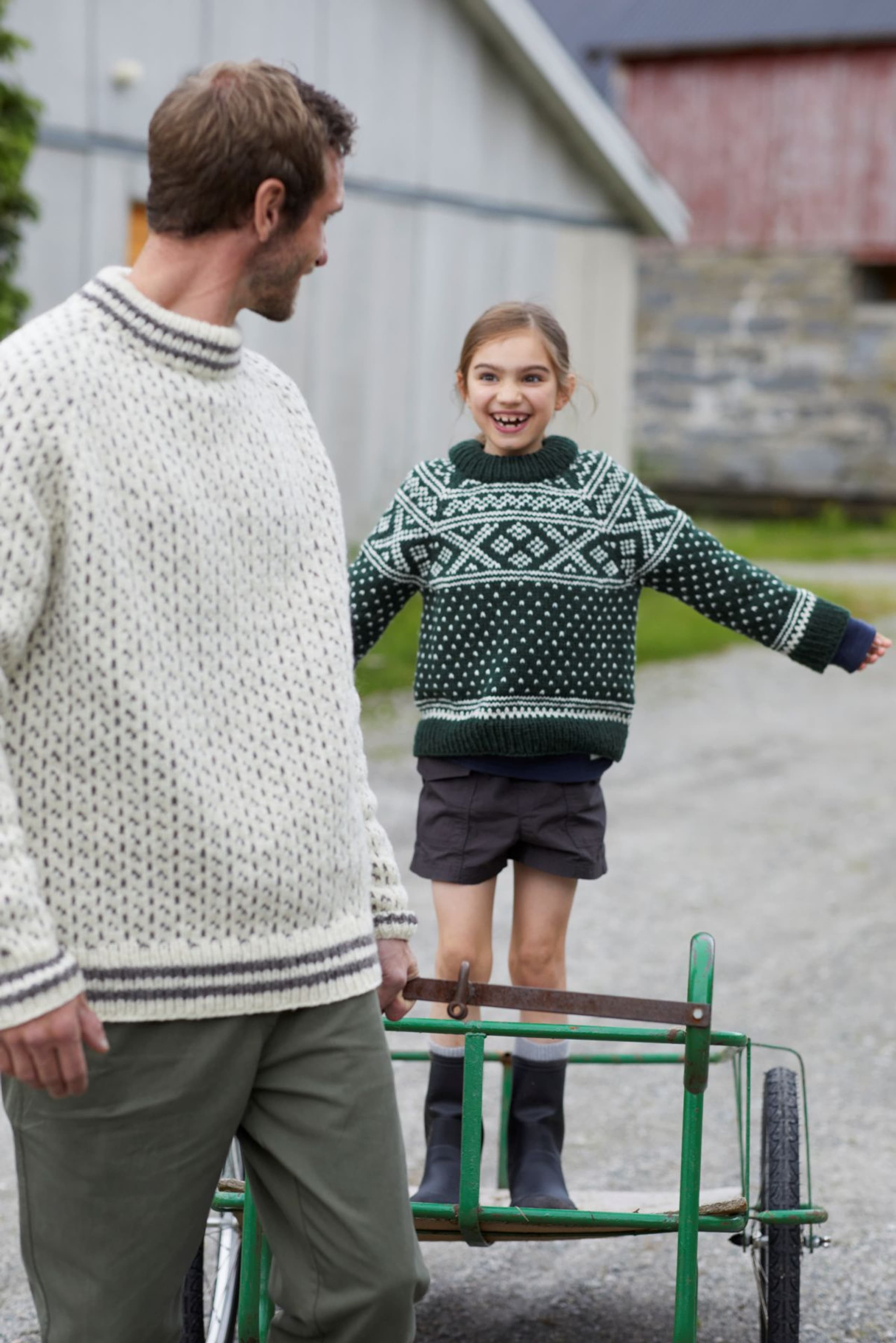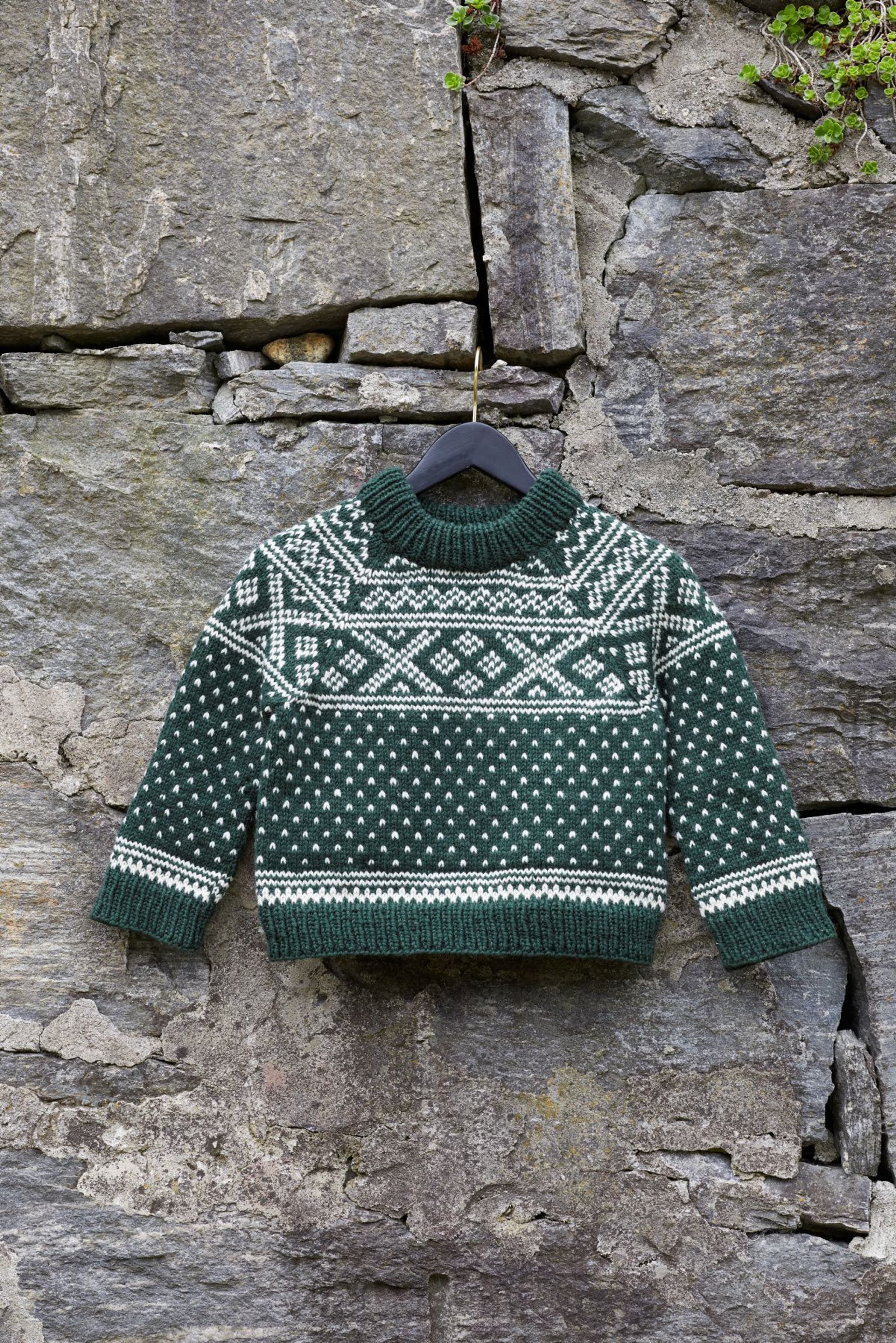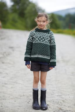 Setesdalgenser til barn er strikket i det klassiske Setesdalmønsteret med bred mønsterbord over bærestykket og lus over bol og ermer. Kantene på bol og ermer har også en bred mønsterbord før vrangbordene. Genseren har en avslappet, rett og avslappet fasong og er strikket ovenfra og ned. Først strikkes en lang halskant med vrangbord, som senere brettes inn mot vrangen og sys til. Etter halskanten formes halsringningen ved å strikke vendepinner, samtidig som det strikkes mønster og økes til raglan. Det økes på hver side av en raglan-maske, mønsteret er symmetrisk på hver side av raglan-m, slik at alle delene starter og slutter på samme sted i mønsteret. Etter raglanøkningen deles arbeidet inn til for- og bakstykke og ermer, som videre strikkes hver for seg. For en avslappet passform, velg en størrelse som er 11-16 cm større enn barnets brystvidde