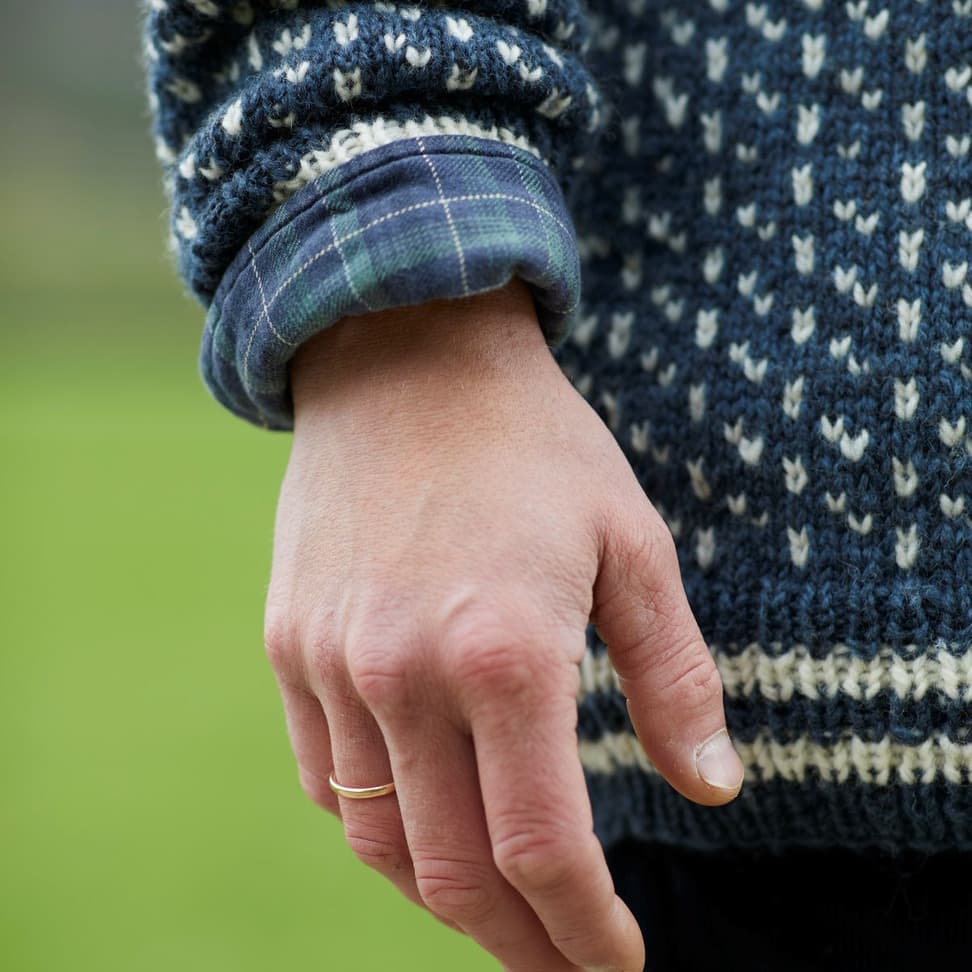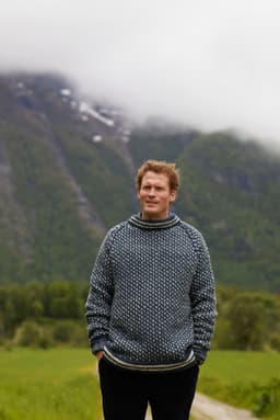 Strikket nedenfra og opp Islender til herre er en helmønstret raglangenser strikket i det klassiske islender-mønsteret. Genseren har en rett og avslappet fasong med rund hals. Den strikkes nedenfra og opp. Først strikkes vrangbord med striper, før man strikker mønster på bolen. Ermene strikkes på samme måte, før delene settes på samme pinne og strikkes sammen. Mellom raglanfellingene strikkes en liten mønsterbord. For en avslappet passform, velg en størrelse som er 14-22 cm større enn din egen brystvidde.