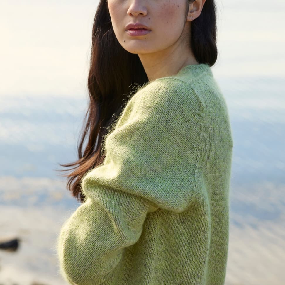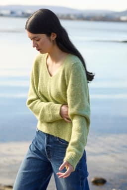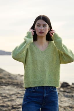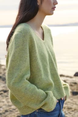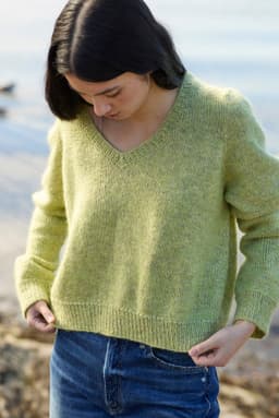 Hilma V-halsgenser er en glattstrikket, kort genser i en deilig pusete blanding av Finull og Plum. Genseren har en pen, formstrikket fasong og ser ut som den har isatte ermer, men hele skulderkonstruksjonen strikkes i ett – alá en avansert raglanøkning. Vrangborder på bol, ermer og utringning rammes inn av en rille i begynnelsen og slutten. Rillen gjentas også på toppen av skulderen som et dekorativt element som understreker fasongen. Genseren strikkes ovenfa og ned. Først strikkes bakstykket med vendepinner for å forme skrå skuldre. Så plukkes m opp langs skuldrene og forstykkene strikkes på samme måte. Videre settes forstykkene og bakstykket på samme pinne samtidig som man strikker opp masker til ermetoppene langs hver side av arbeidet. Man fortsetter over alle maskene samtidig som man først øker masker til ermene, og deretter til både bol og ermer. Samtidig øker man også til v-hals. Når økningene er ferdig, deles arbeidet, og ermer og bol strikkes videre rundt hver for seg og avsluttes med vrangbord. Til slutt strikkes det opp masker langs hele utringningen, og halskanten strikkes i ribb med fellinger midt foran.