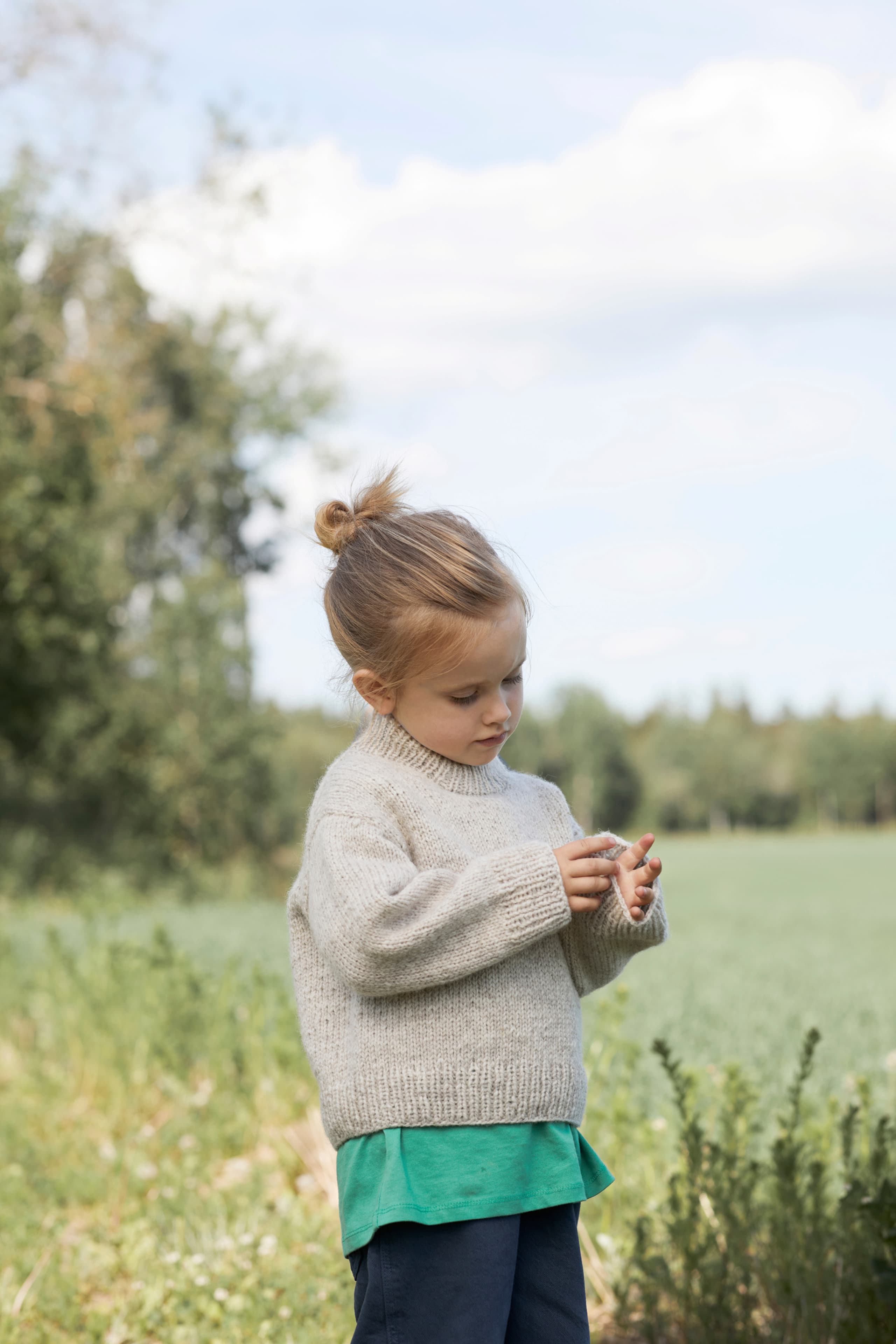 Teltusgenser er en glattstrikket genser med «European shoulders» (skrå skuldre) som strikkes ovenfra og ned. Genseren har en ledig passform, rund hals og kanter i vrangbord i 1x1 ribb. Arbeidet starter med bakstykket, som strikkes frem og tilbake, samtidig som det økes til skrå skuldre. Deretter strikkes det opp masker langs skuldrene og hvert forstykke strikkes hver for seg med økninger til halsutrigning. De to forstykkene strikkes så sammen til ett forstykke og det fortsettes i glattstrikk, frem og tilbake. Videre samles forstykket og bakstykket på samme pinne. Bolen strikkes rundt og avsluttes med vrangbord. Deretter strikkes det opp masker til ermer rundt ermehullet. Ermene strikkes først frem og tilbake med vendepinner for å forme ermetoppen, deretter strikkes de rundt og avsluttes med vrangbord. Til slutt strikkes halskanten i vrangbord og brettes dobbel innover og sys fast med løse sting.