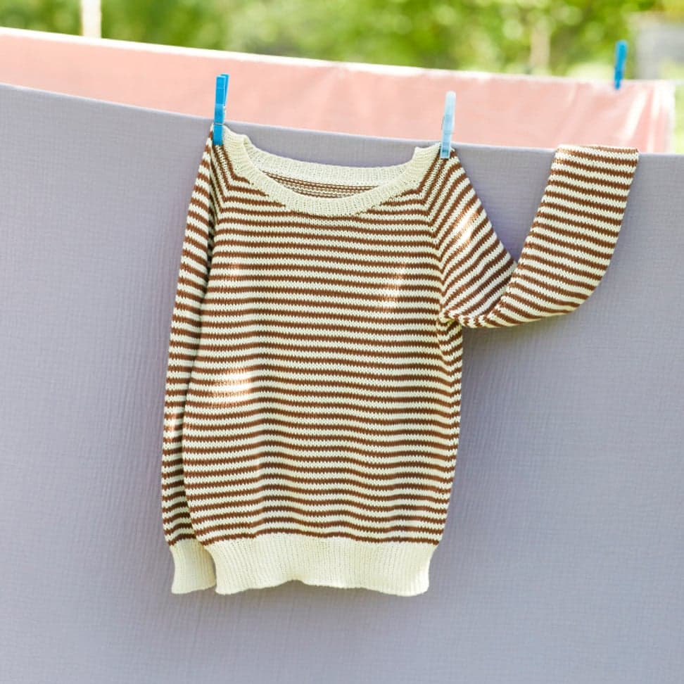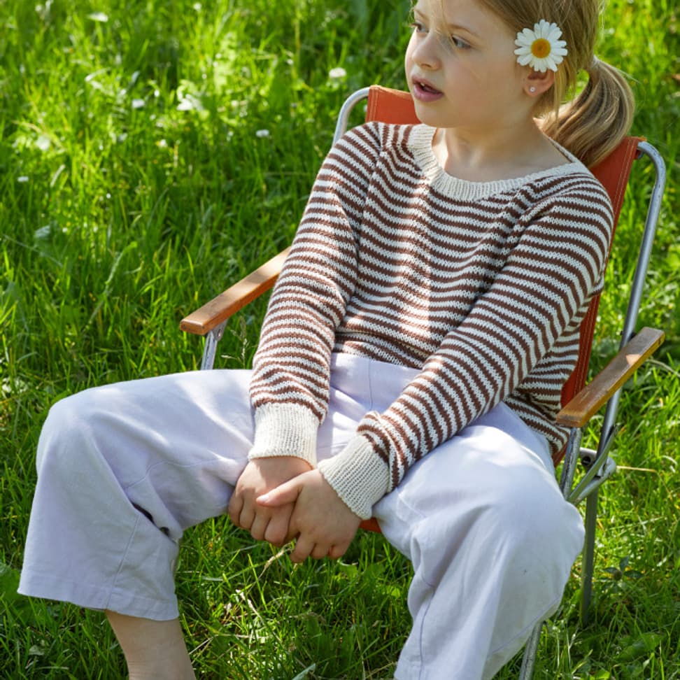 Flora stripegenser er en enkel glattstrikket genser med smale striper, rund hals og klassisk passform. Genseren strikkes ovenfra og ned med raglanøkninger og ribbestrikkede kanter. Først strikkes halskanten, og videre strikkes bærestykket. Halsringningen formes ved å strikke vendepinner og det økes samtidig til raglan. Etter raglanøkningene, deles arbeidet til ermer og bol, og hver del strikkes videre hver for seg og avsluttes med ribbekanter.