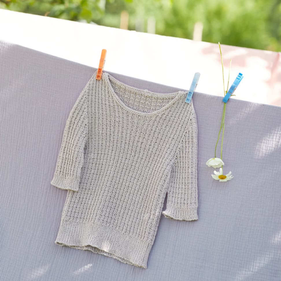 Lilje t-skjorte har klassisk passform, rund hals og trekvart lange ermer. T-skjorten strikkes ovenfra og ned i en ribbstruktur med rette og vrange m. Ribbstrukturen gjør at t-skjorten blir tøyelig og samtidig former seg etter kroppen. Først strikkes nakke- og skulderpartiet frem og tilbake mens det økes til halsringning foran, og samtidig økes det til skuldre. Deretter legges det opp m midt foran og arbeidet fortsettes rundt. Samtidig økes det til ermer, og videre til ermer og bol samtidig. Så deles arbeidet inn til bol og ermer, og hver del strikkes for seg og avsluttes med ribbekanter. Til slutt strikkes det opp masker langs halsåpningen og det strikkes i-cord-kant rundt.