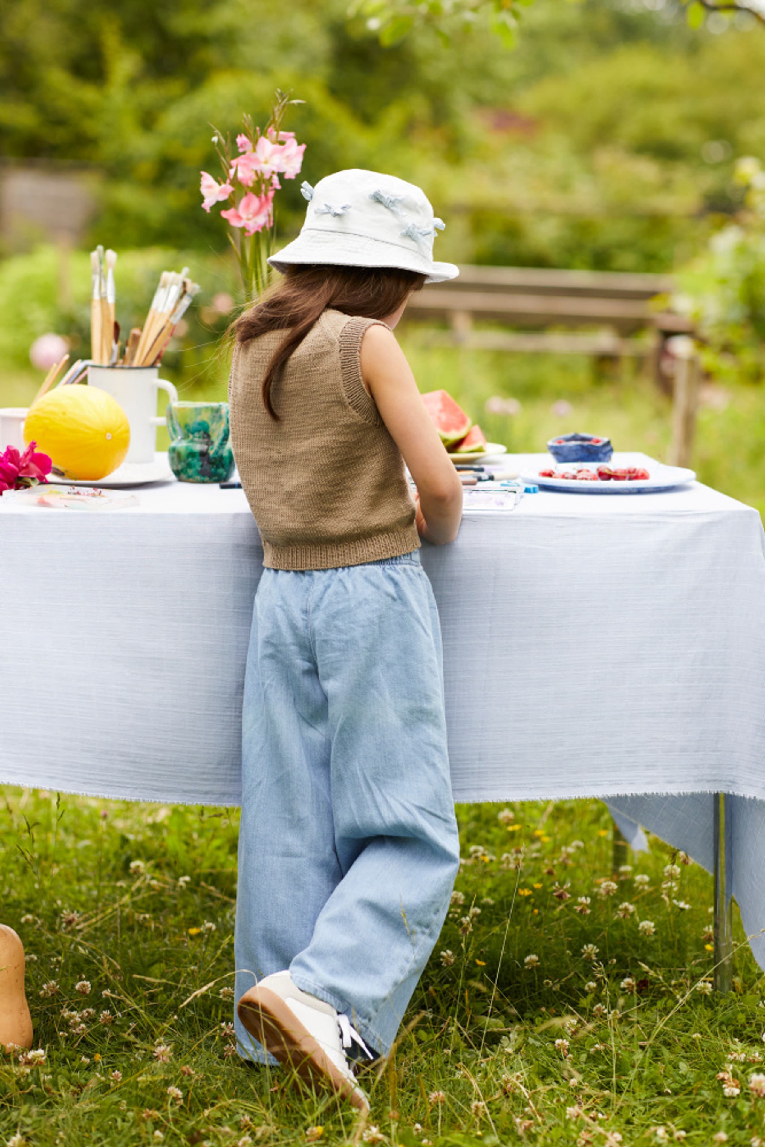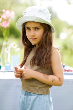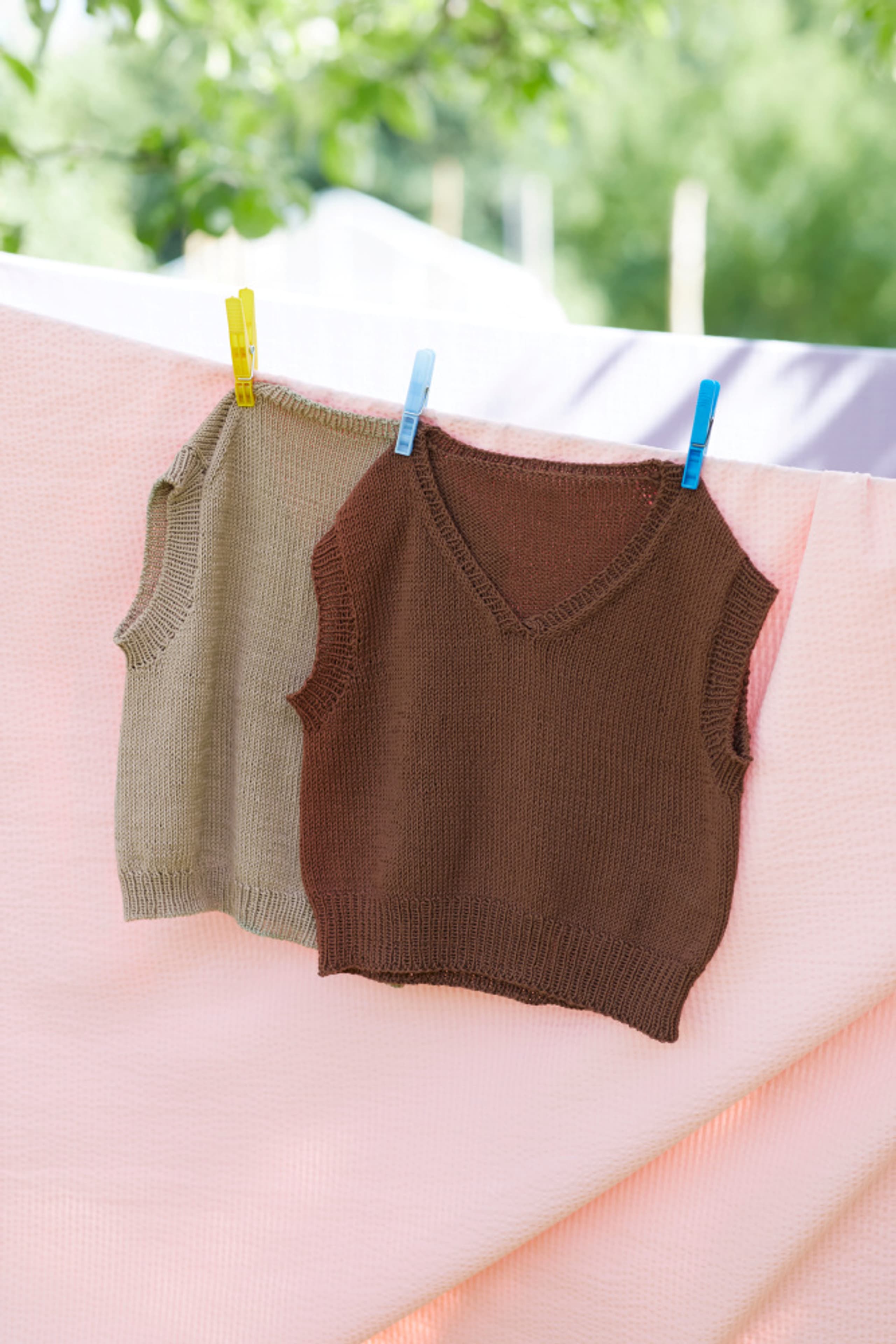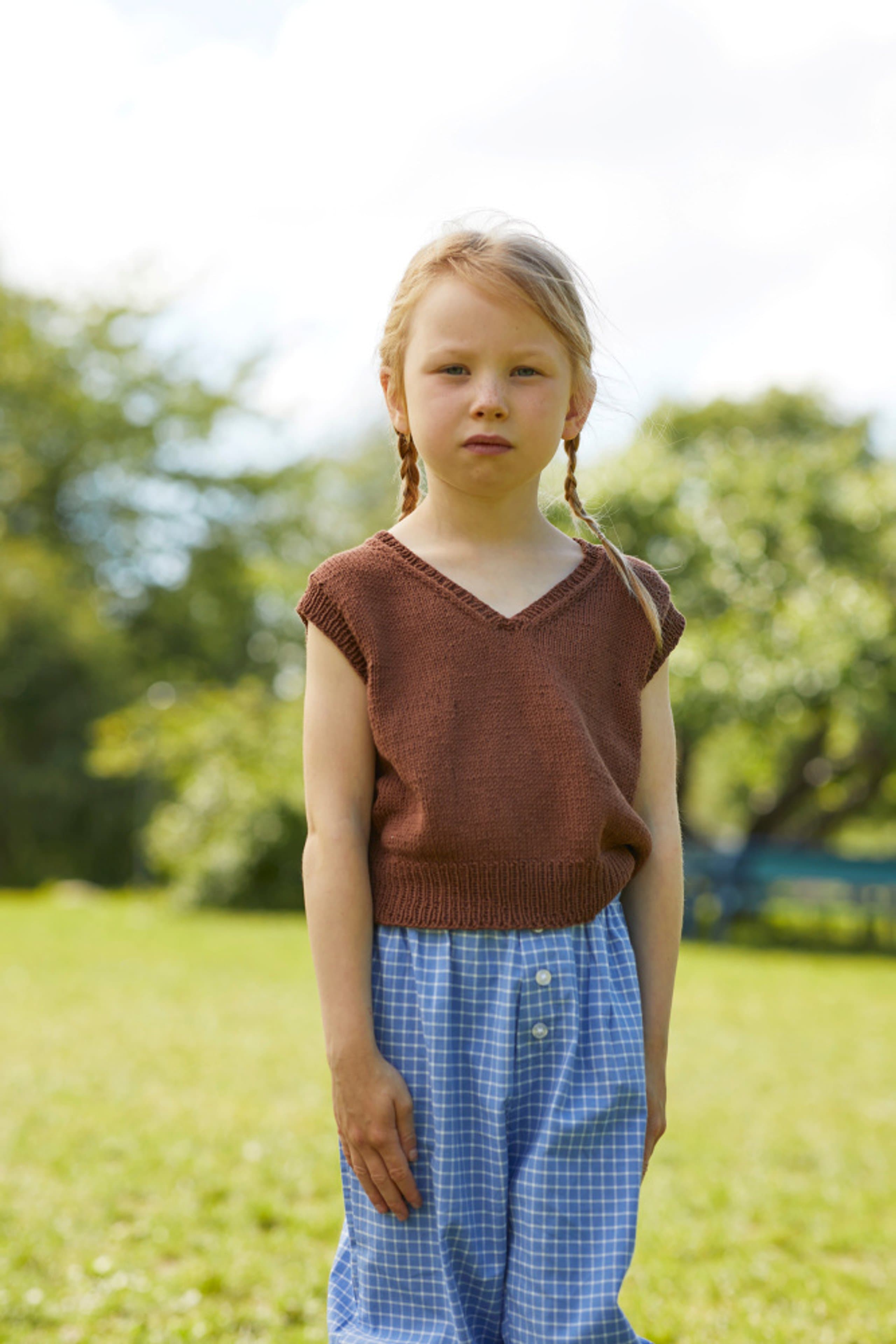 Rose sommervest er en glattstrikket, kort vest med klassisk passform, v-hals og ribbestrikkede kanter. Vesten strikkes ovenfra og ned. Først strikkes bakstykket frem og tilbake og det økes til skrå skuldre. Deretter strikkes masker opp langs skuldrene og hvert forstykke strikkes for seg med økinger til v-hals. Under ermene samles maskene på samme pinne, bolen strikkes rundt og avsluttes med vrangbord. Halskant og ermehullkanter strikkes til slutt i vrangbord.