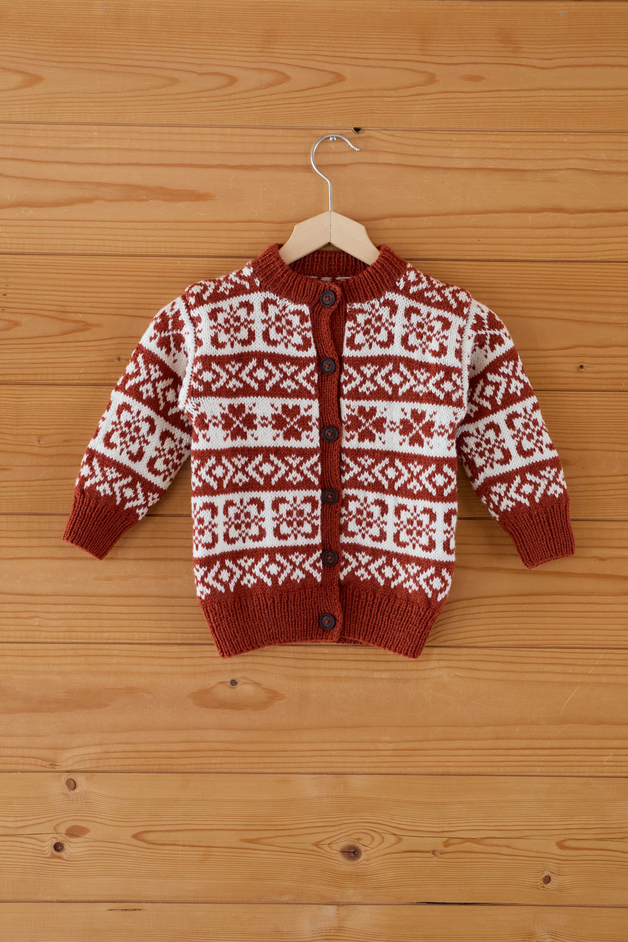 Hyttekofta er en klassisk mønstret jakke i tradisjonell stil, strikket i Pt5, et slitesterkt og maskinvaskbart garn i ull og nylon. Jakken strikkes nedenfra og opp med påsydd stolpe og oppklipp i midten. Mønsteret er bygget opp av border inspirert av gamle kofter, og passer til hele familien. Perfekt til skjermfrie hyttehelger, lesestunder og turopplevelser i frisk luft.
