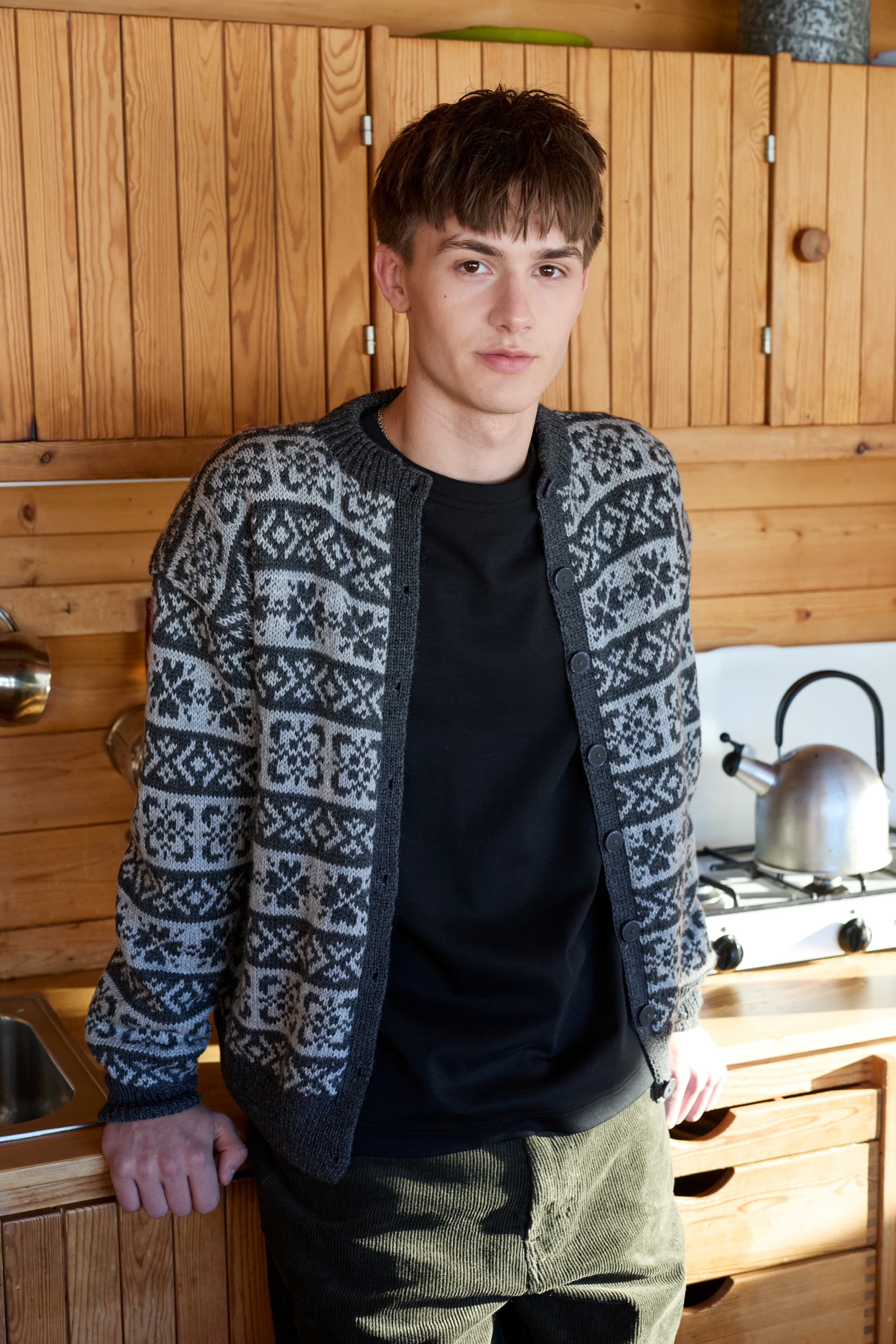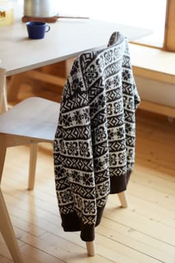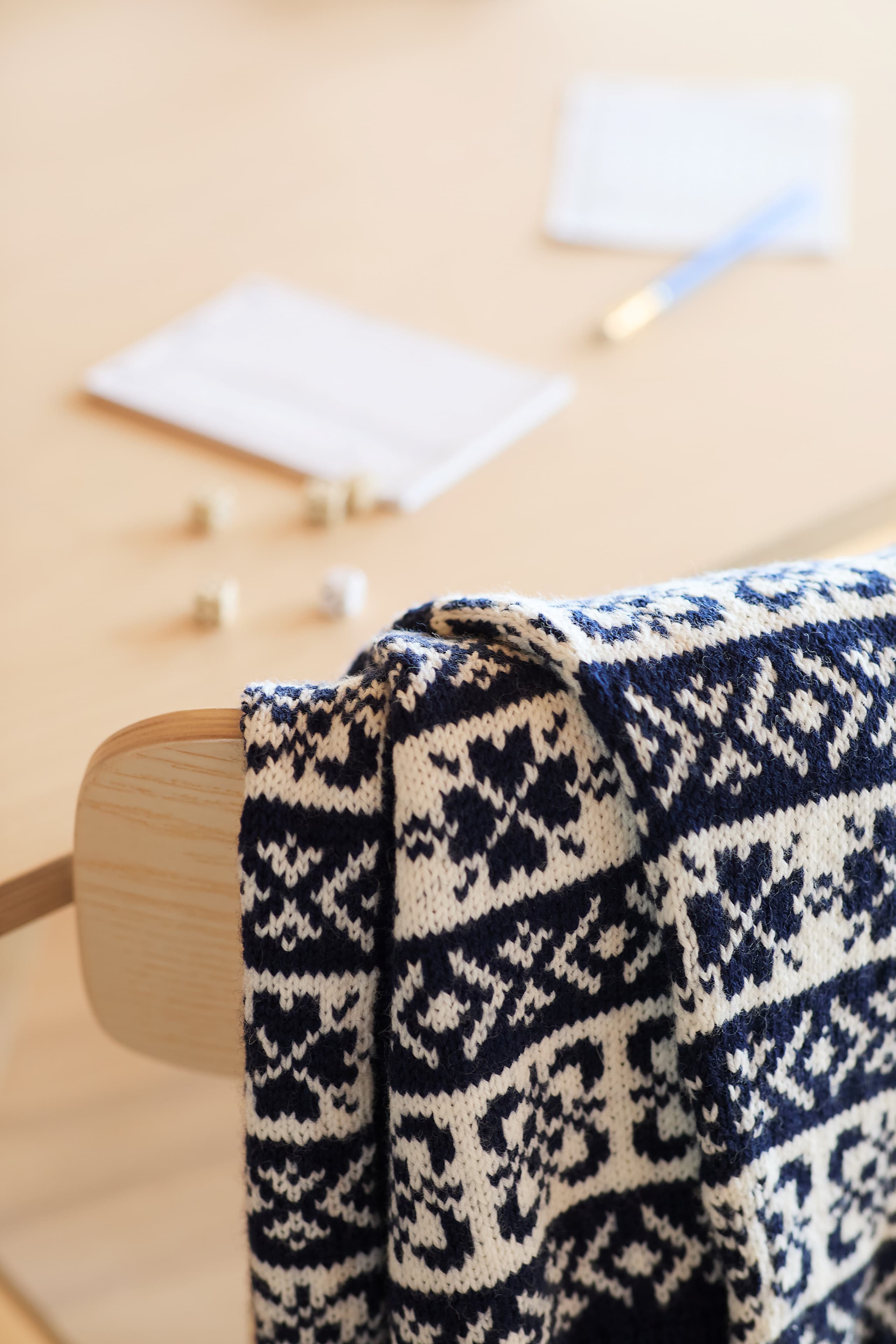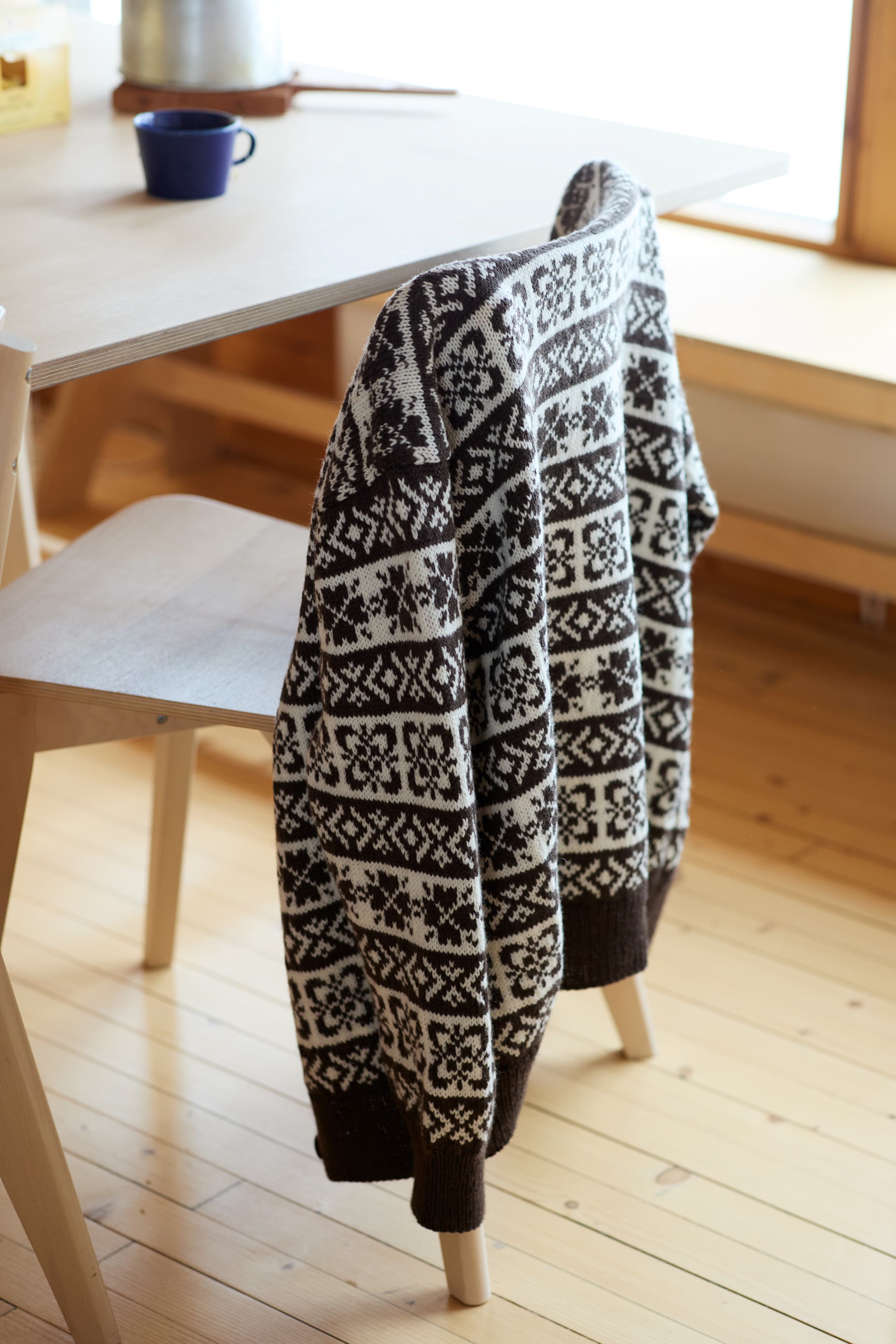 Hyttekofta er en klassisk mønstret jakke i tradisjonell stil, strikket i Pt5, et slitesterkt og maskinvaskbart garn i ull og nylon. Jakken strikkes nedenfra og opp med påsydd stolpe og oppklipp i midten. Mønsteret er bygget opp av border inspirert av gamle kofter, og passer til hele familien. Perfekt til skjermfrie hyttehelger, lesestunder og turopplevelser i frisk luft.