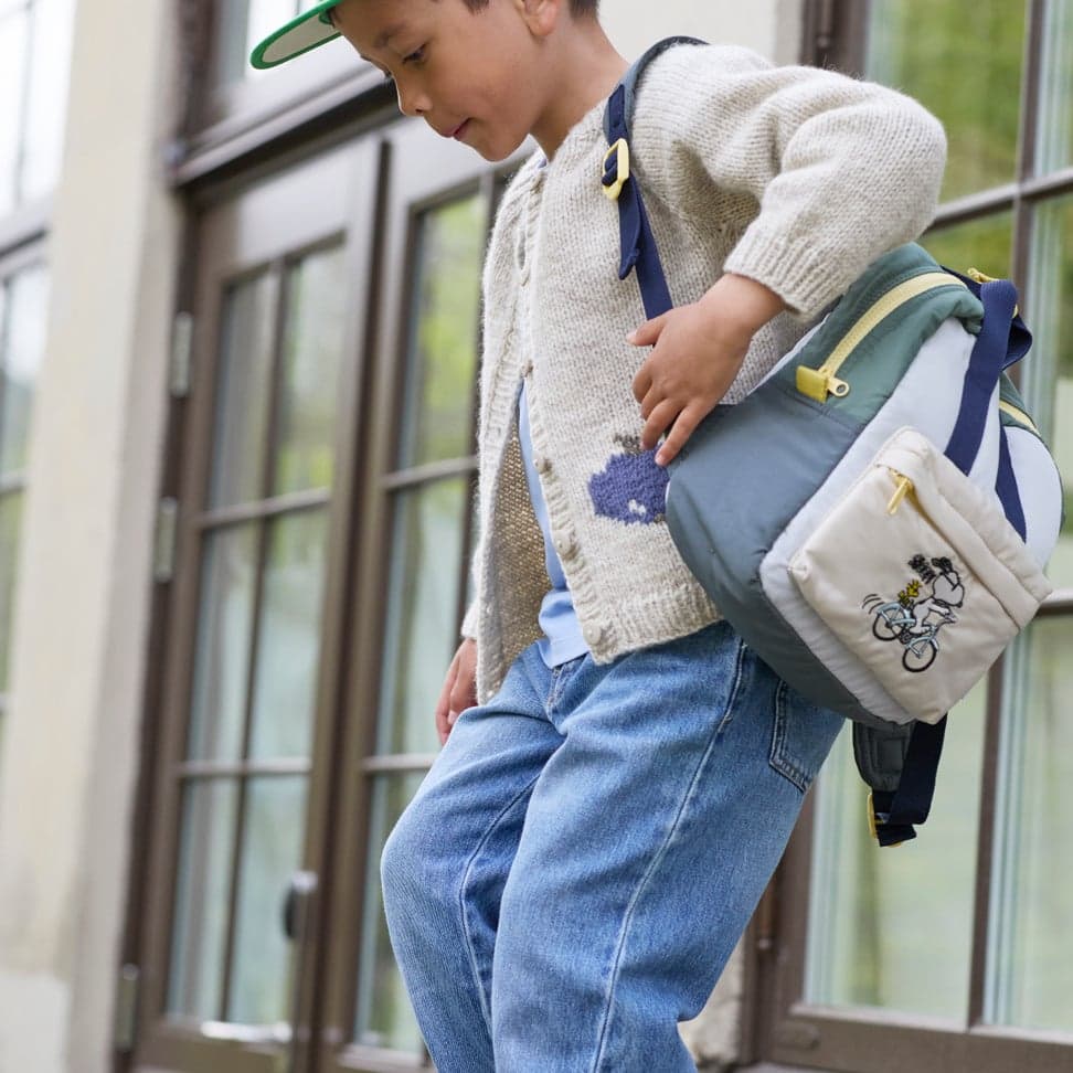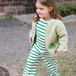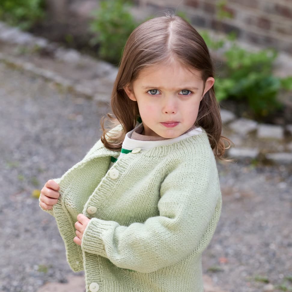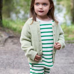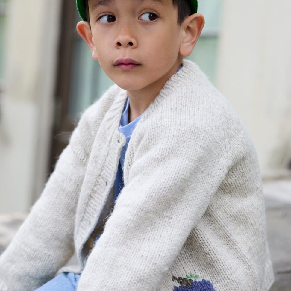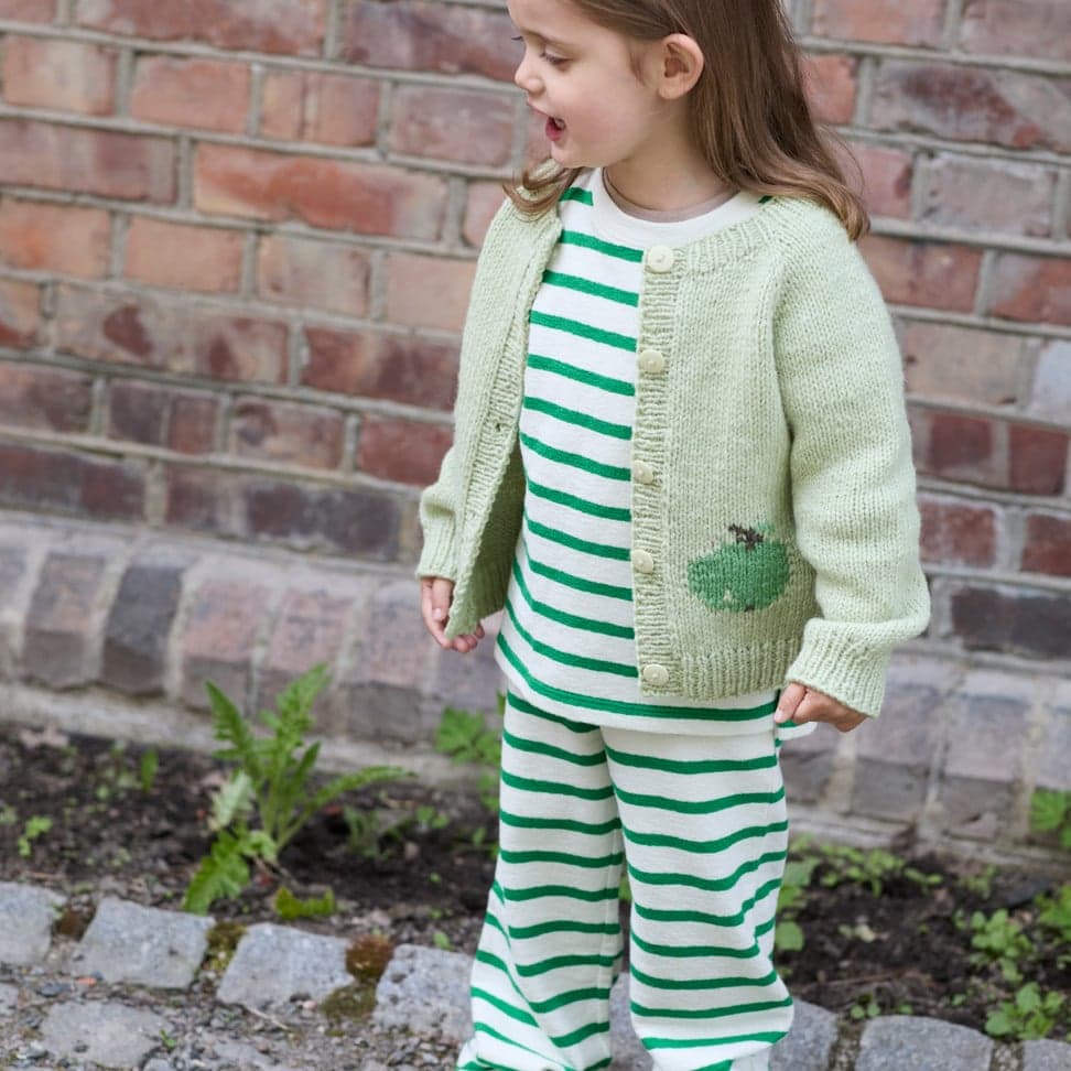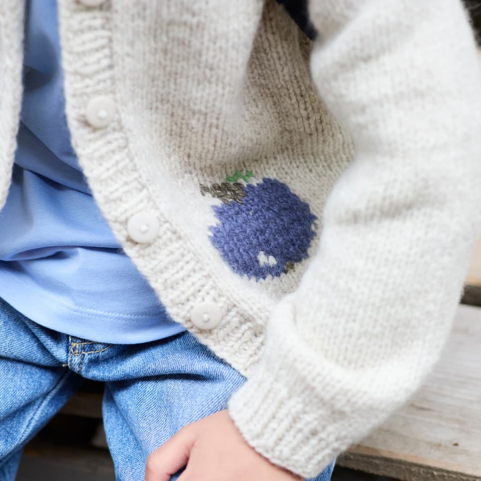 Fruktig jakke er en enkel glattstrikket jakke, med kanter i 1x1 ribb og et søtt eplemotiv strikket i intarsiateknikk. Jakken har en klassisk passform og strikkes frem og tilbake, ovenfra og ned. Arbeidet starter i halsen. Halsutringningen formes ved å strikke vendepinner, samtidig som det økes til raglan på hver side av raglan-maskene. Når raglanøkningene er ferdige, strikkes bolen og ermer hver for seg, og avsluttes med ribb. Til slutt strikkes det opp masker til knappestolpene som strikkes i 1x1 ribb. Det strikkes knapphull på den ene stolpen og sys knapper på den andre.