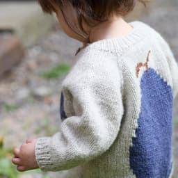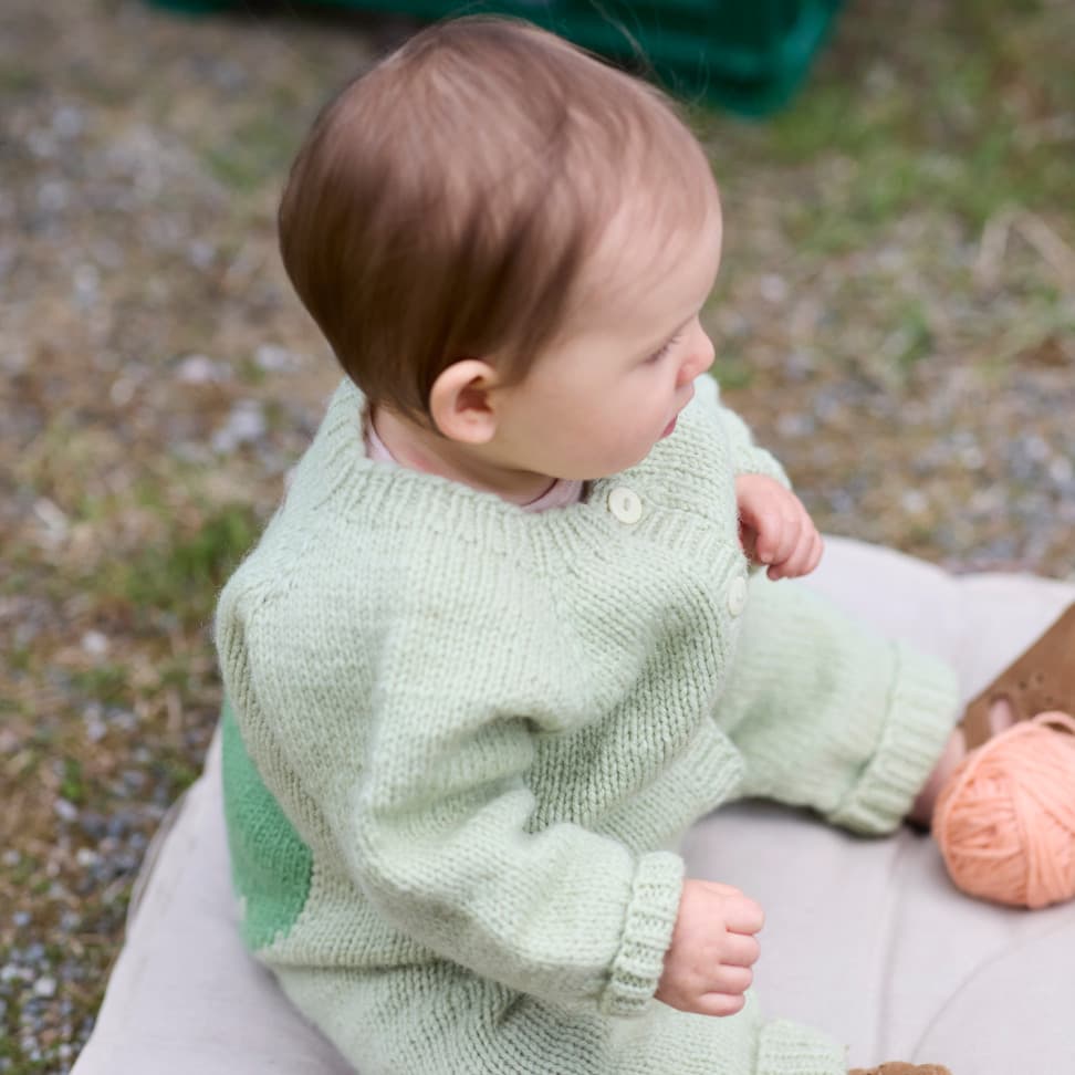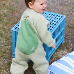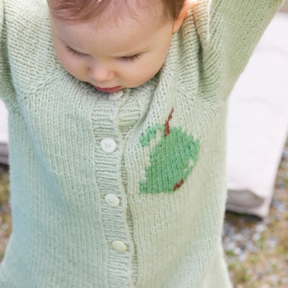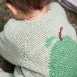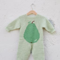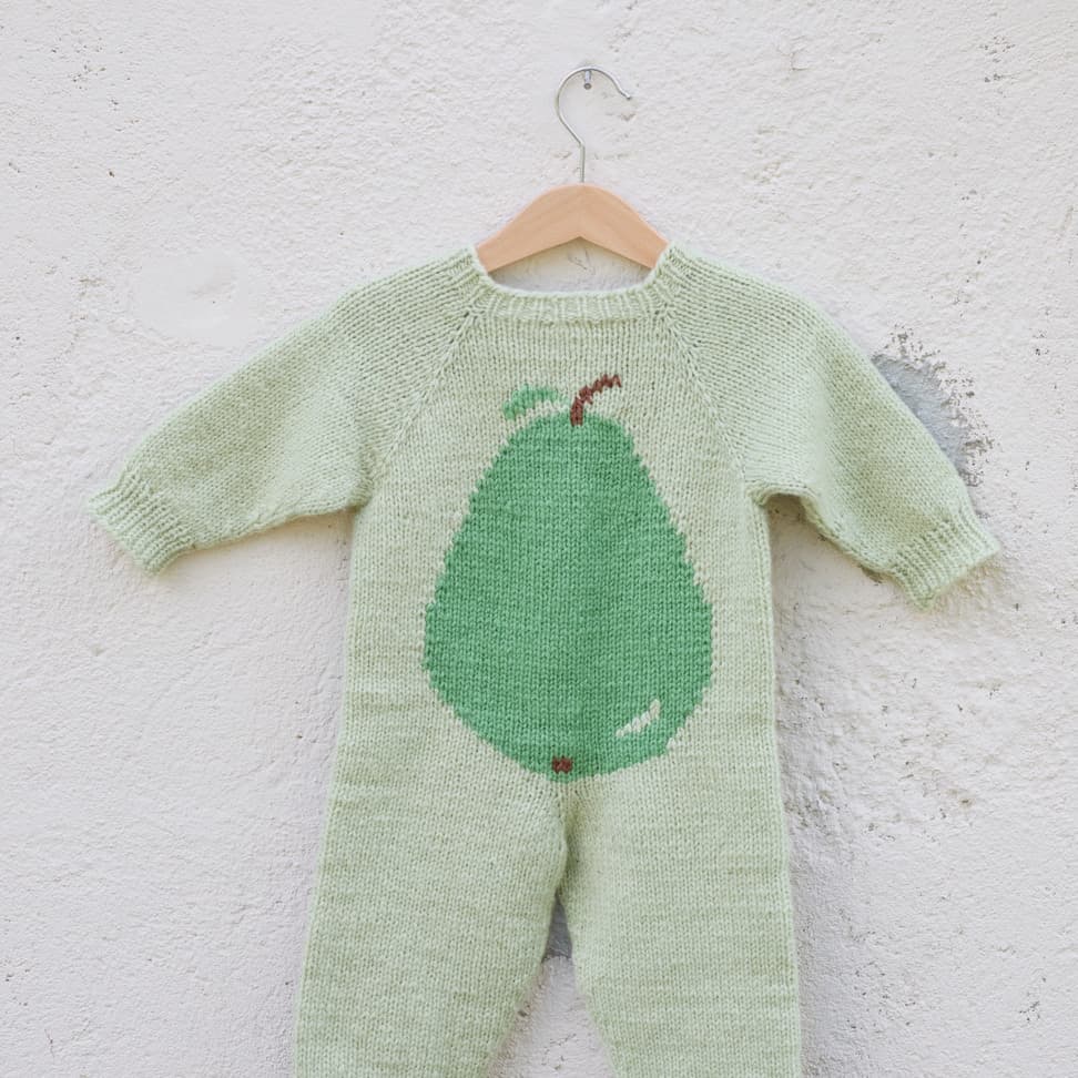 Pæredressen er et herlig hverdagsplagg for små barn med lekne detaljer! Den er glattstrikket med søte pæremotiv i intarsiateknikk og strikkes ovenfra og ned. Den har ei stor pære på ryggen og ei lita pære på venstre forstykket. Dressen har raglanøkninger, rund hals, åpning foran og kanter i 1x1 ribb.