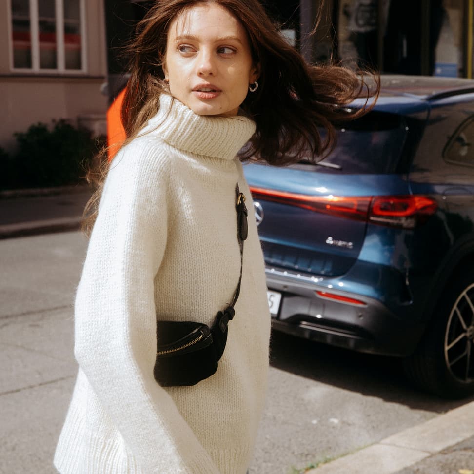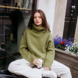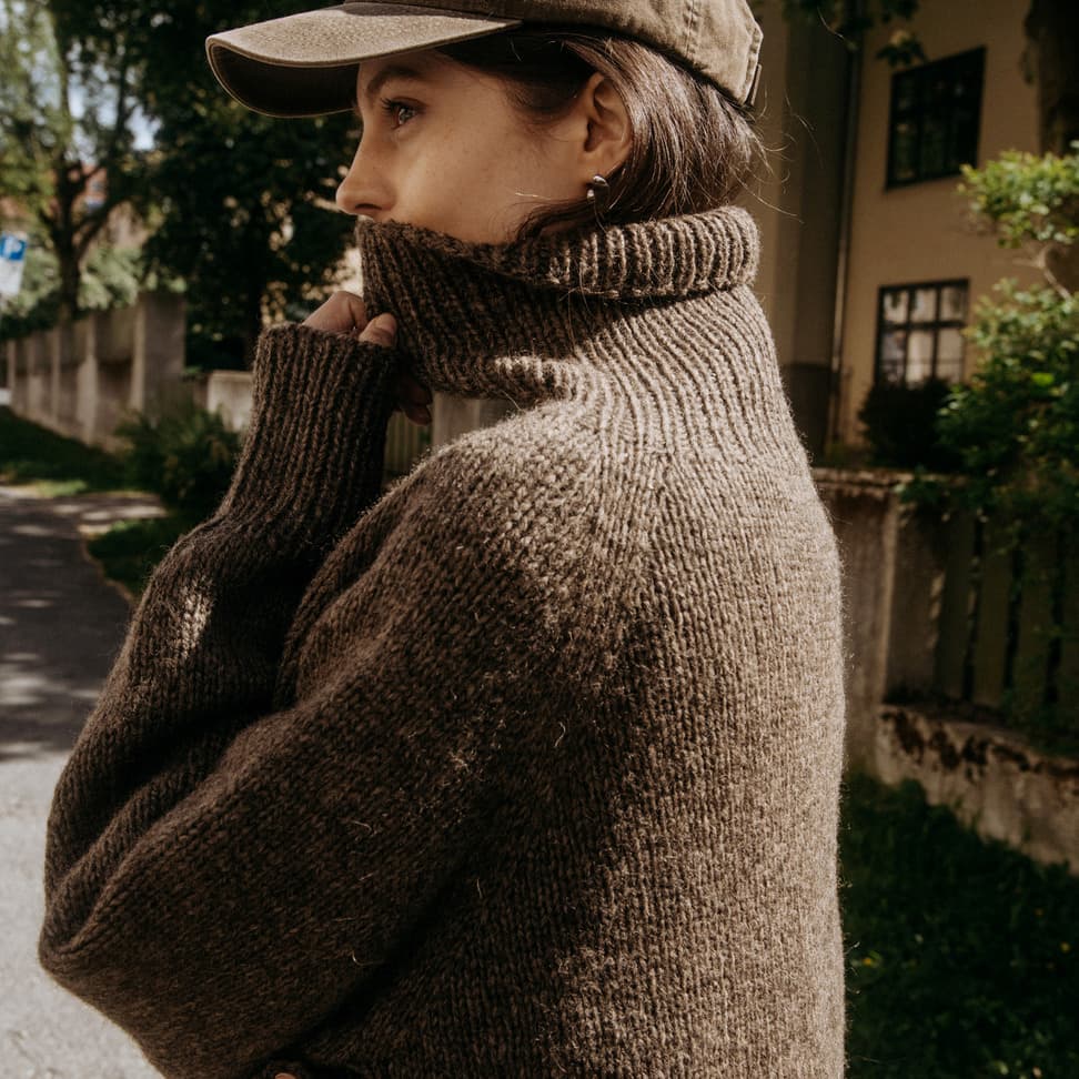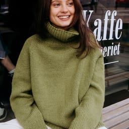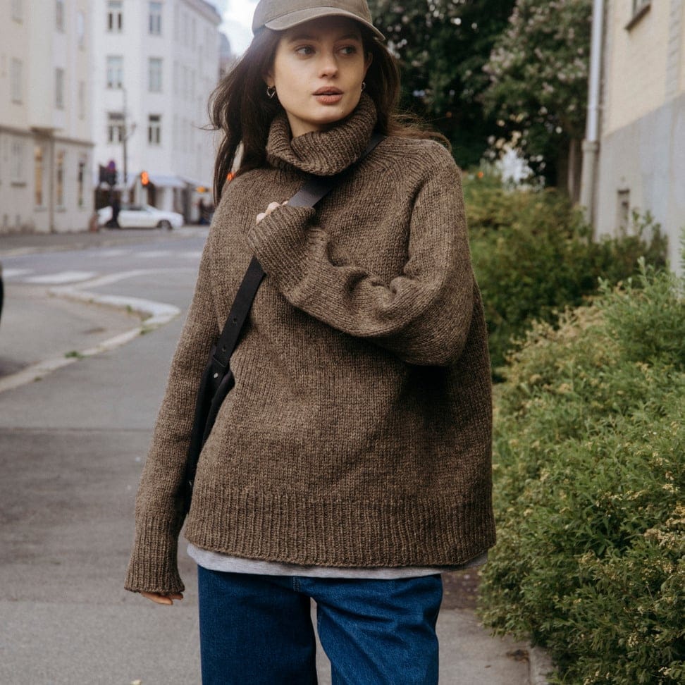 Heia raglangenser is an oversized and soft autumn sweater made from 100% Norwegian wool. It is knitted in Vams, a thick and airy yarn, making this a perfect project for beginners. A modern basic sweater with a high neckline and a fit that suits most. You can choose to fold down the collar, or let it keep you really warm on cold days.