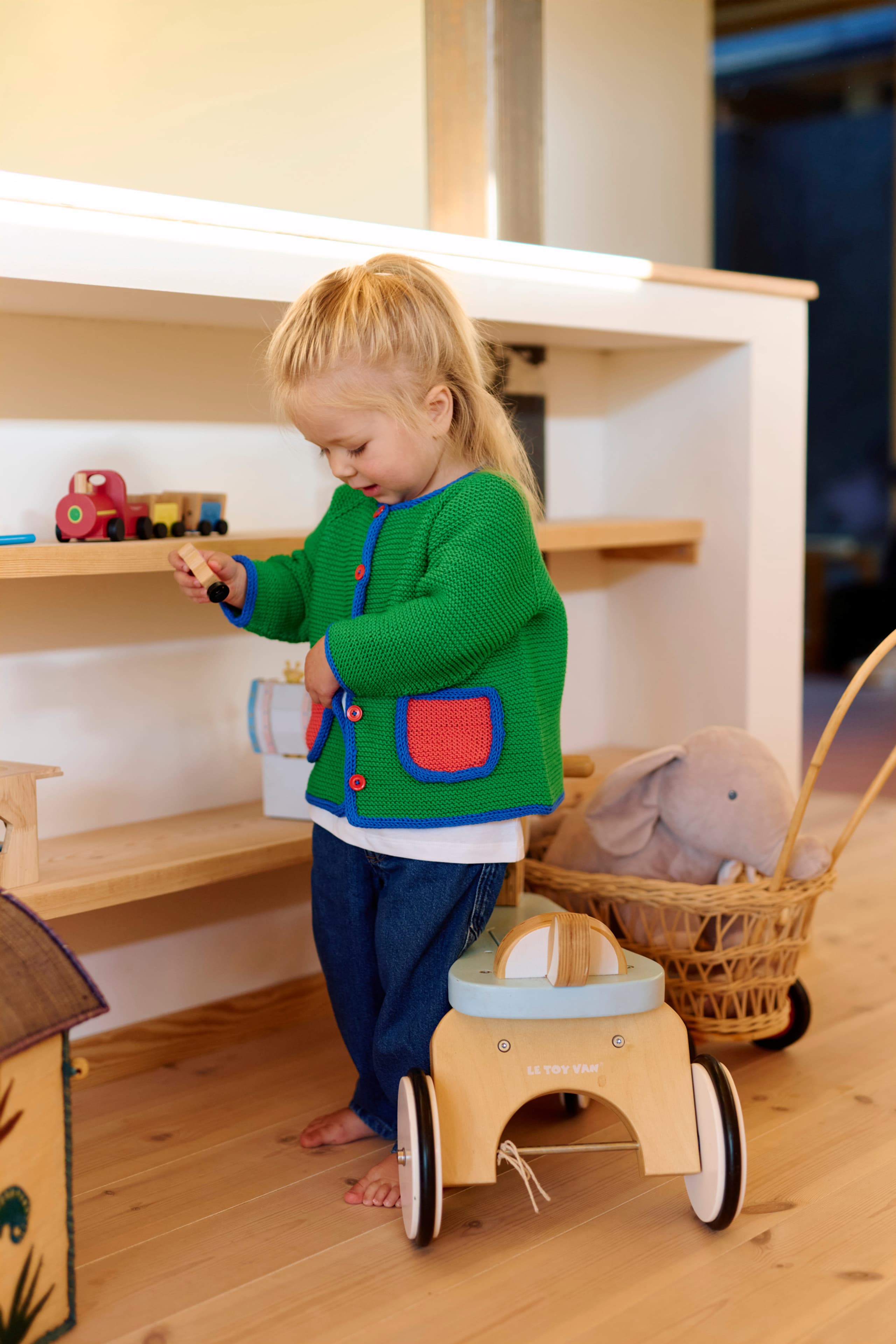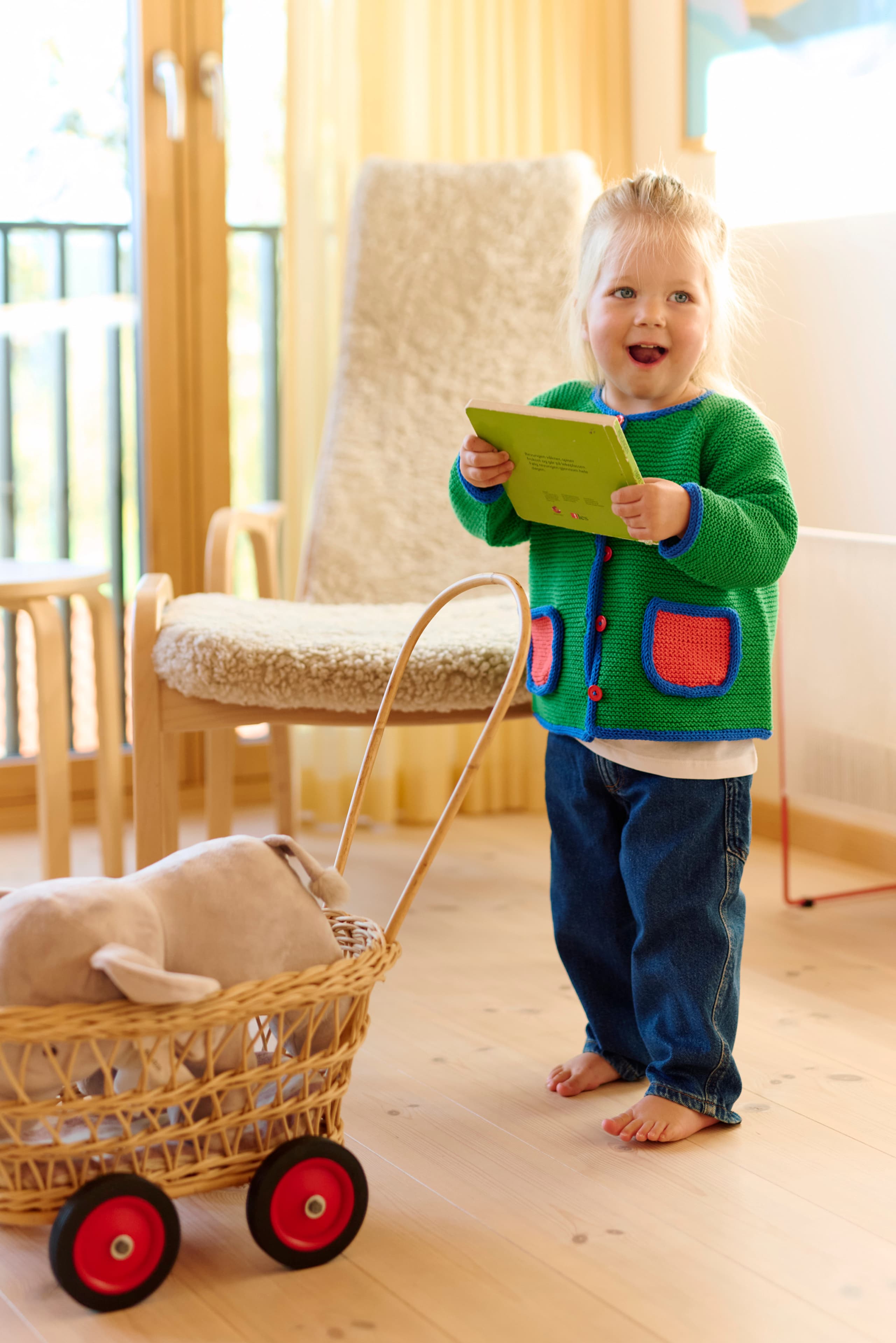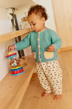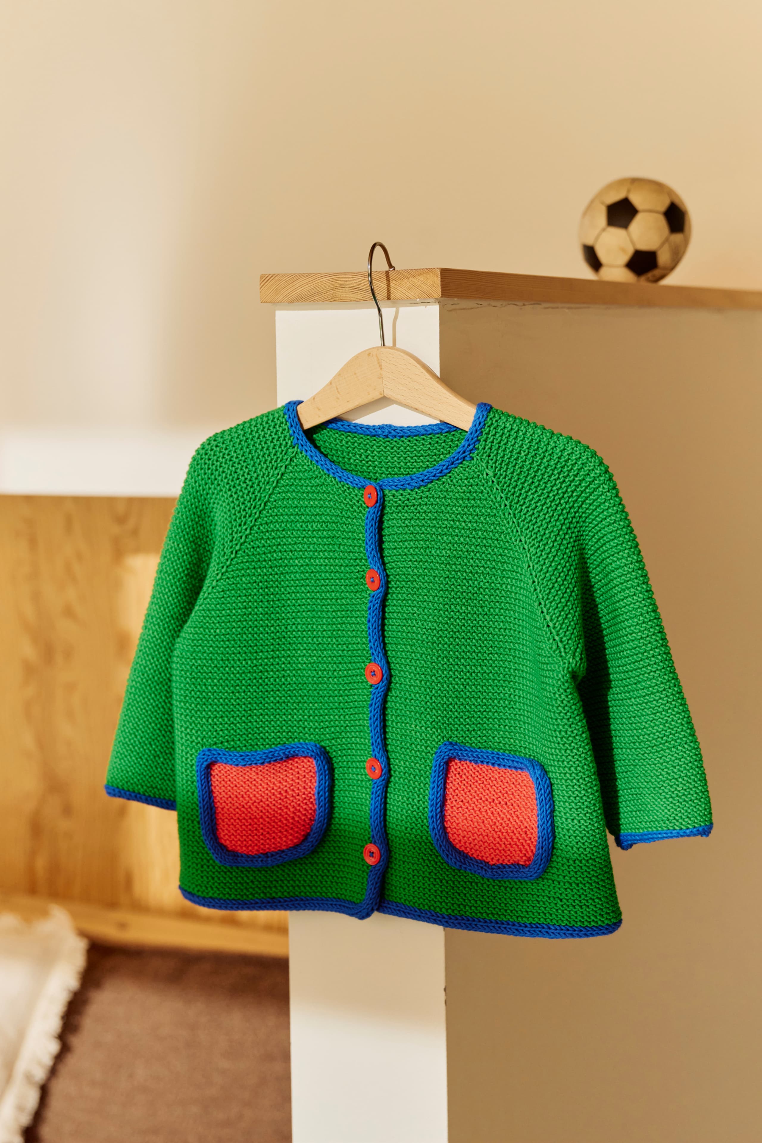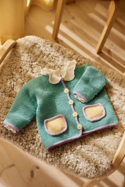 Bompi sommerjakke er en søt og leken rillestrikket jakke med romslig fasong – perfekt for småbarn i farta. Jakken strikkes ovenfra og ned med raglanøkninger og vendepinner i nakken for en pen og behagelig passform. I-cord-kanter og små lommer foran rammer inn plagget og gir et sjarmerende og gjennomført uttrykk. Den enkle konstruksjonen og de nøye gjennomtenkte detaljene gjør jakken både praktisk, holdbar og estetisk – et ideelt plagg til sommer, lek og hverdagsbruk.