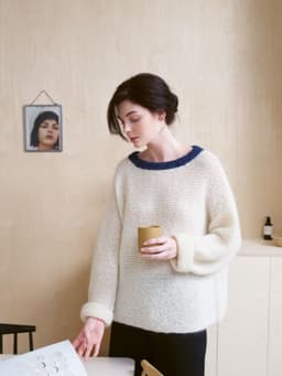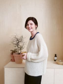 En superenkel rillegenser strikket på tykke pinner. Modellen er romslig og vil strekke seg, men det er nettopp det som gir den avslappede herlige looken. Halskanten er strikket i en tøff blå kontrastfarge. Her er det bare å mikse som man vil! Genseren