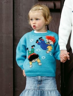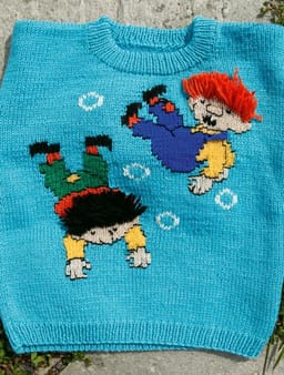 Karius og Baktus. Her er det garnmengde til genser som er beregnet. De øvrige fargene i Pt som er brukt er : 502, 512, 536, 504, 588, 515, 526 og 572. De fargene er i de broderte motivene på genseren.