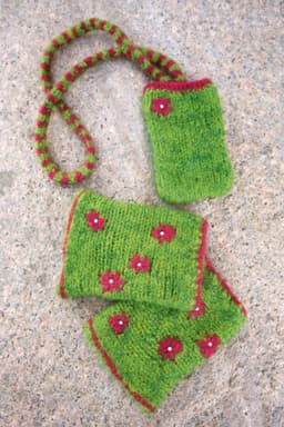 Kjole med og uten ermer, skjerf, leggvarmere, veske og sitteunderlag