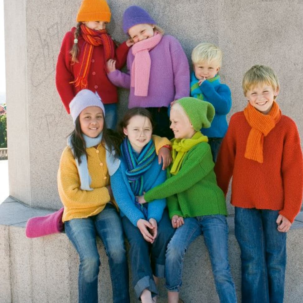 Rettstrikkede jakker, gensere, vest, luer og skjerf.