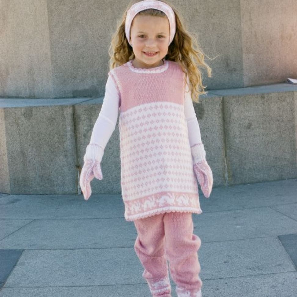 Tunika med kaniner, bukse, votter, ørevarmere og pyntesokker