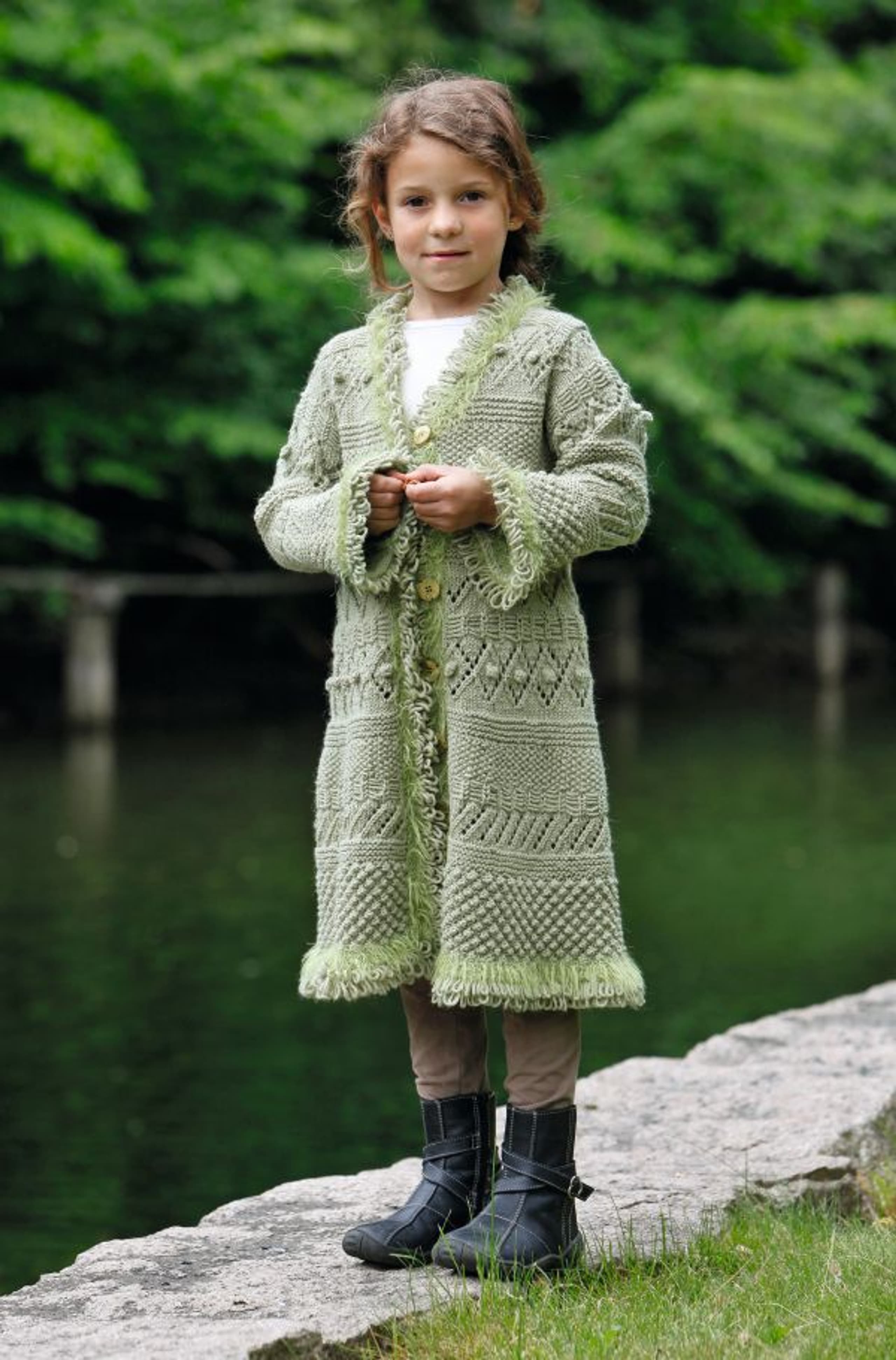 Genser med små blomsterborder og lue