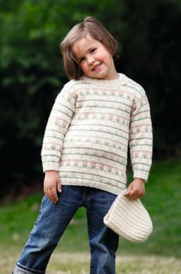 Genser med små blomsterborder og lue