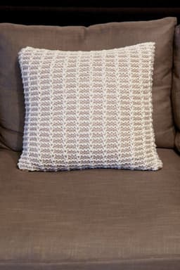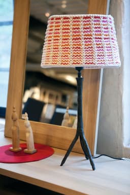 Prego og Pt Helårsgarn. Målene gjelder lampeskjermen. Puten er stor nok til en innerpute på 50 x 50 cm.