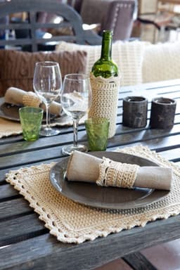 Heklet spisebrikke, mansjett til serviett/bestikk og flasketrekk