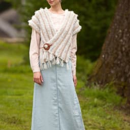 Vesten strikkes i 2 remser, som syes sammen til slutt. NB! Ønsker du frynser, klipp av tråden ved hvert fargeskift med en tråd-ende ca 15 cm og knyt en knute.