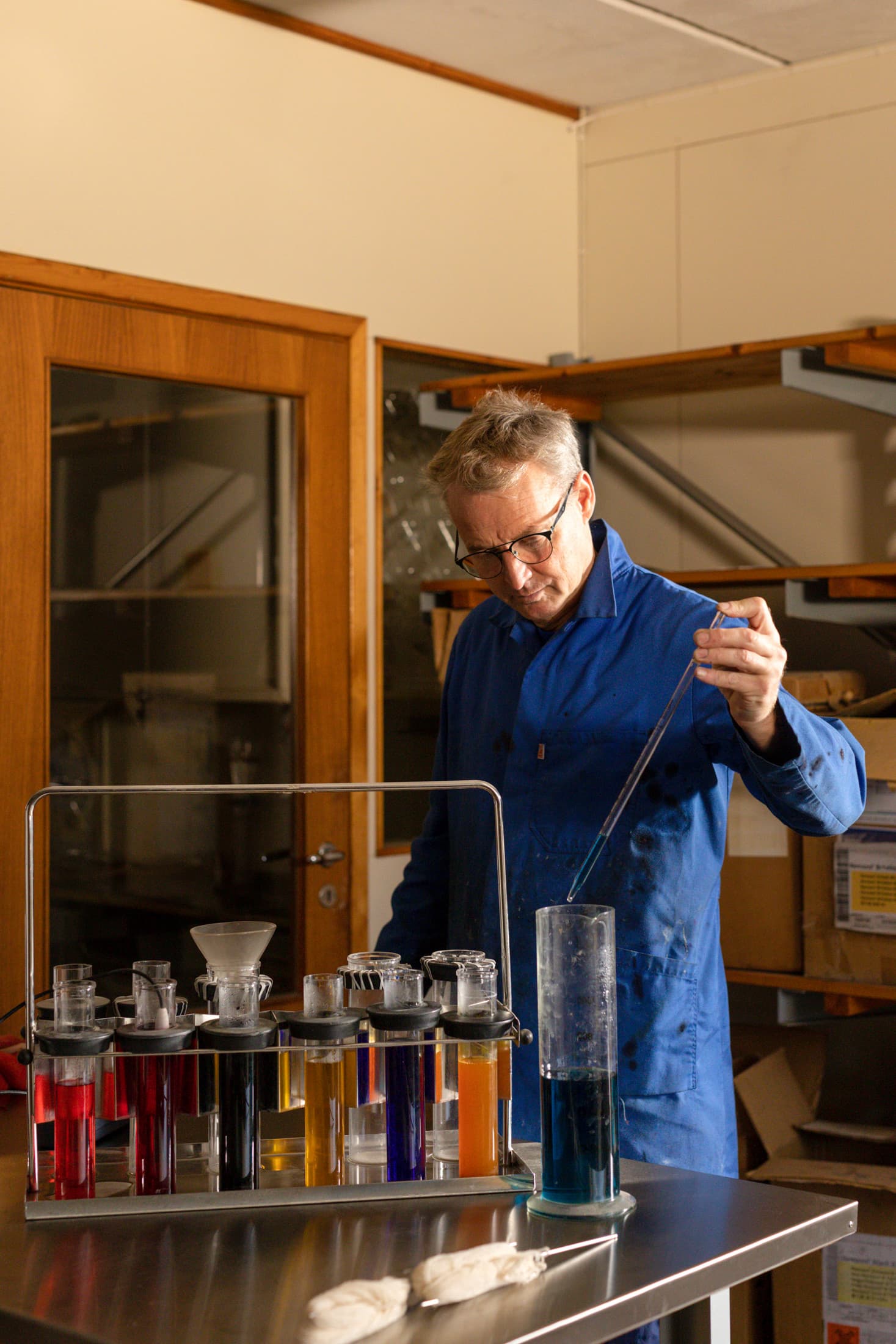 Her blandes ulike ullkvaliteter for å oppnå den kvaliteten som ønskes, og ulla får tilbake volumet etter å ha vært sammenpresset i ullballer. Når vi lager meleringer skjer blandingen her med svart og hvit ull.